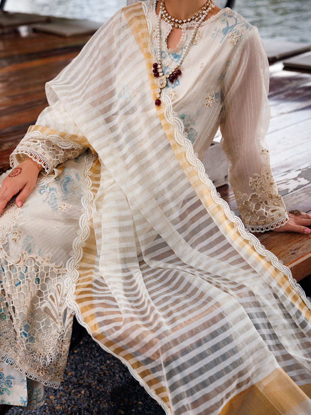Embroidered Stripe Organza Shirt With Striped Dupatta & Maple Silk Printed Trouser