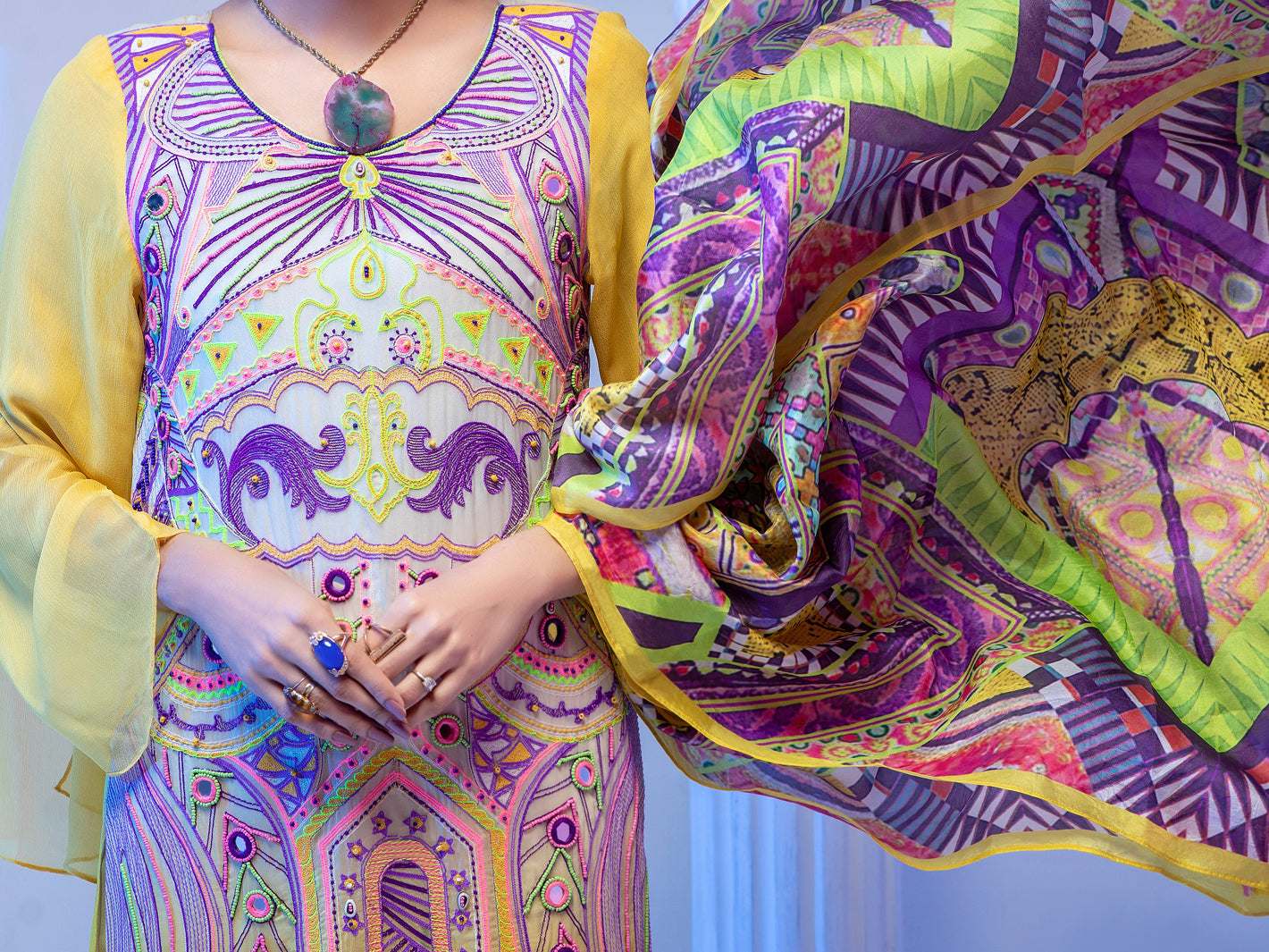 Sunny Yellow Embroidered Front With Bell Sleeve, Paired With Cigarette Pants And Adorned With Beautiful Digital Printed Silk Dupatta