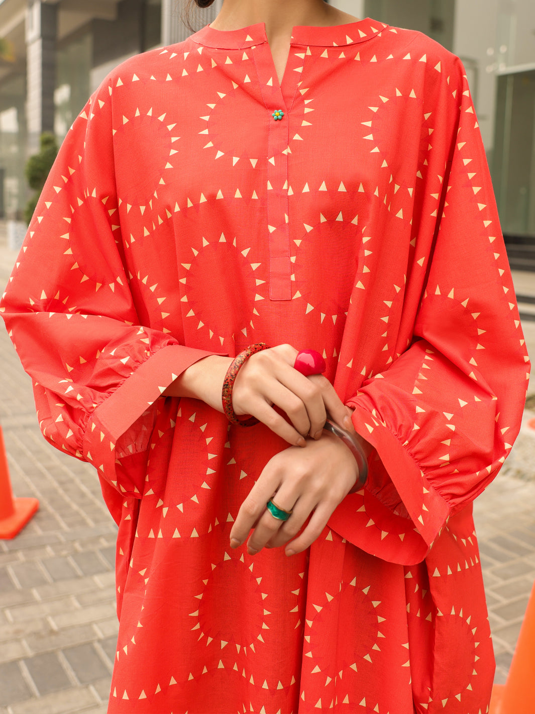 Loose Style High-Low Printed Lawn Shirt With Gathered Sleeves Detailed With Cuff