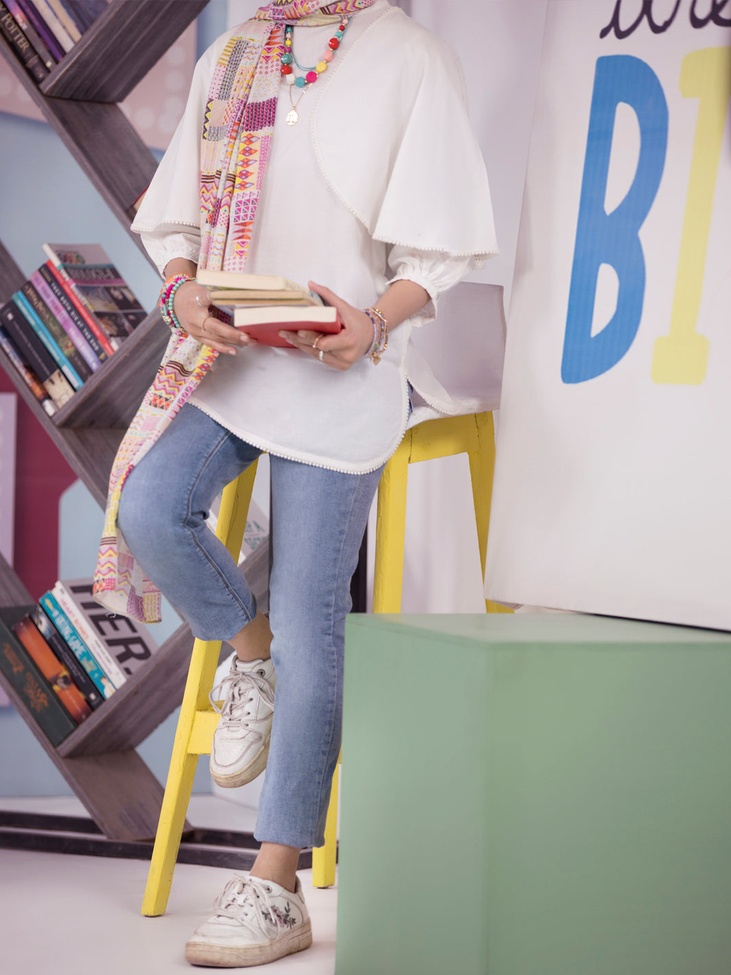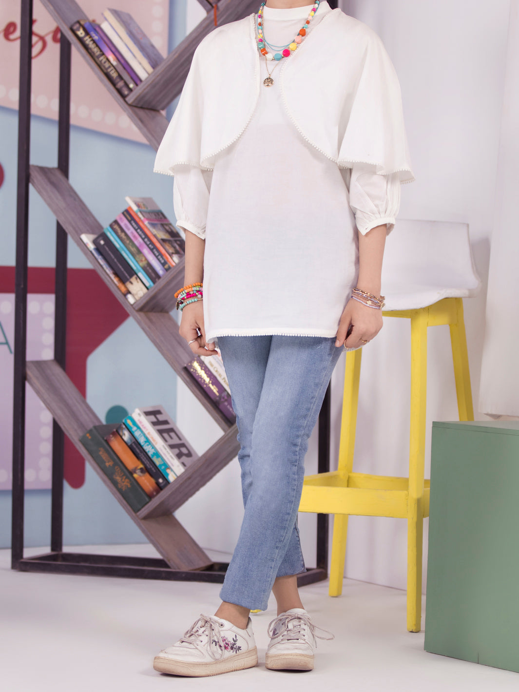 Short Decent White Kurti With Cape Styled Sleeves With Details Of Lace On It