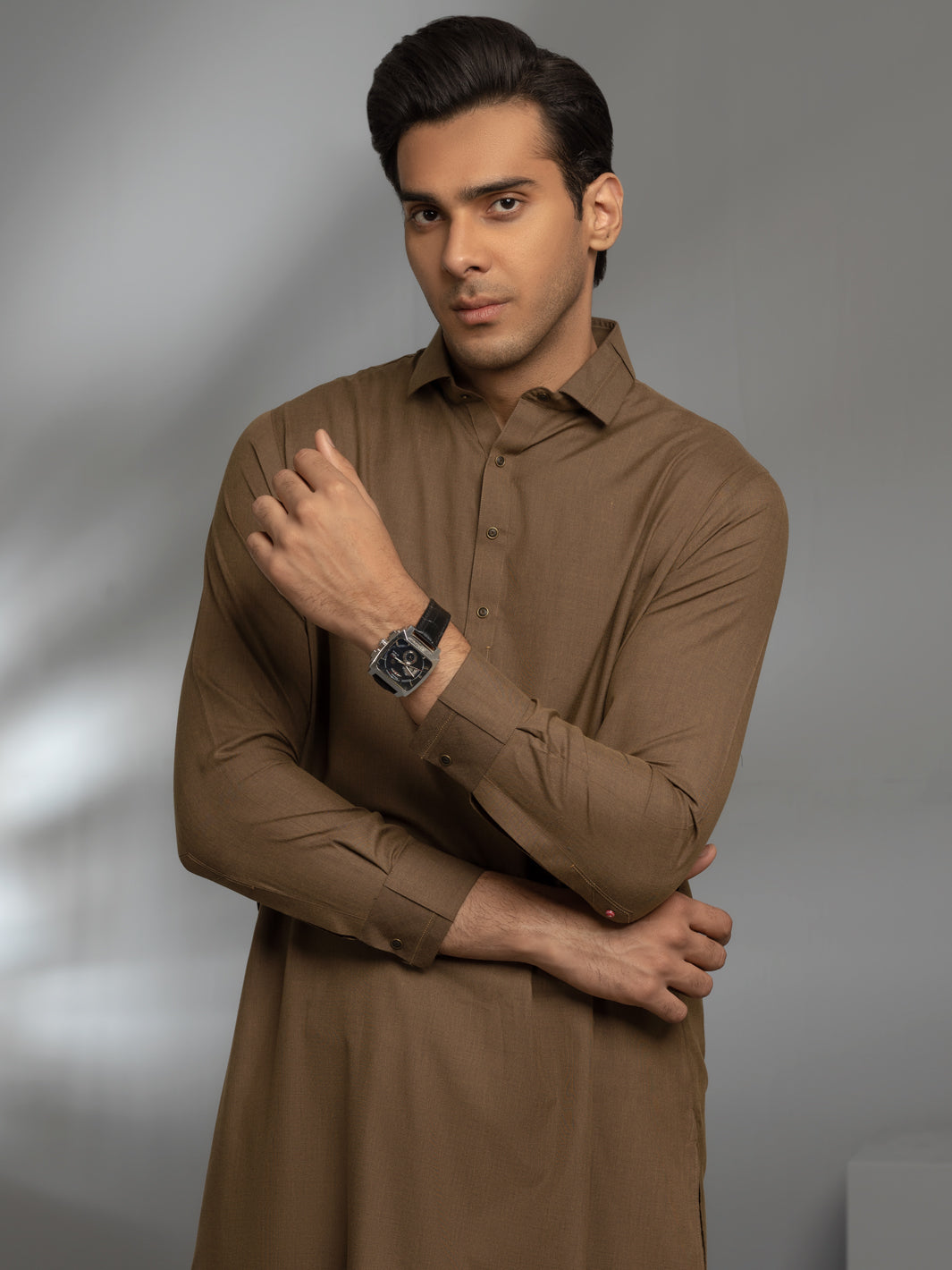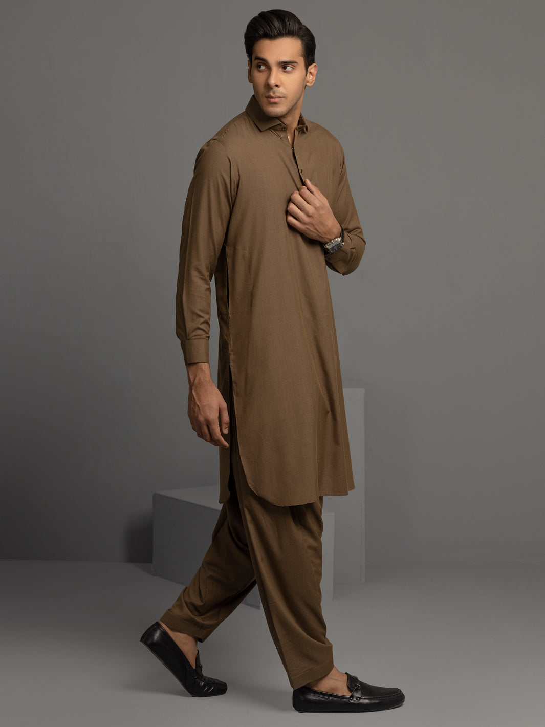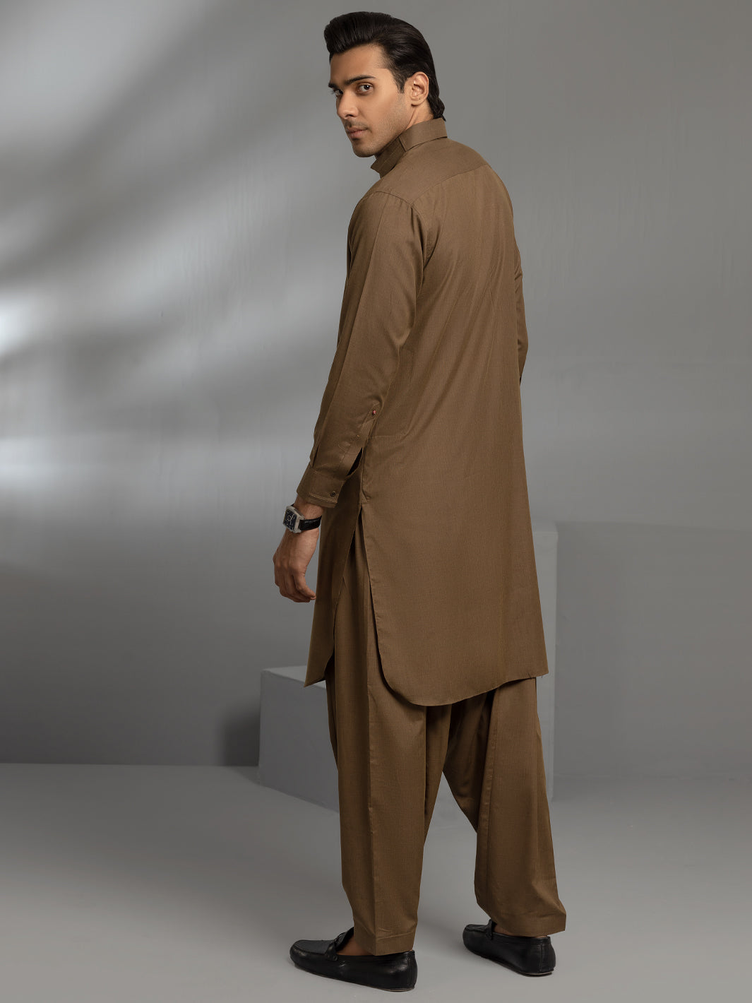 Olive Brown Kameez Shalwar With Metallic Snap Buttons