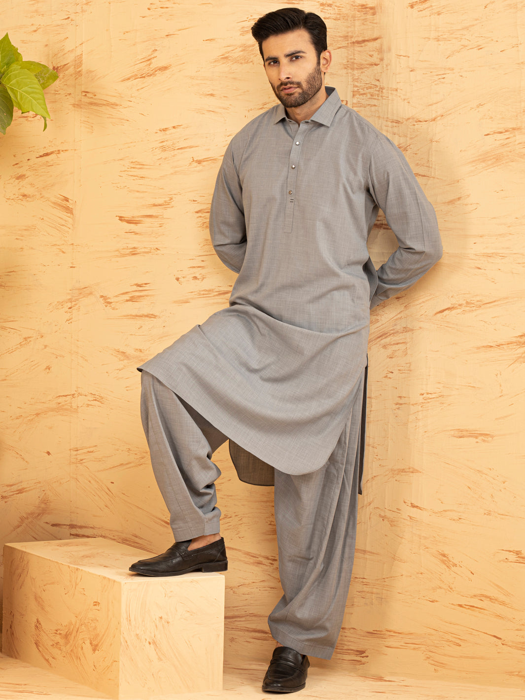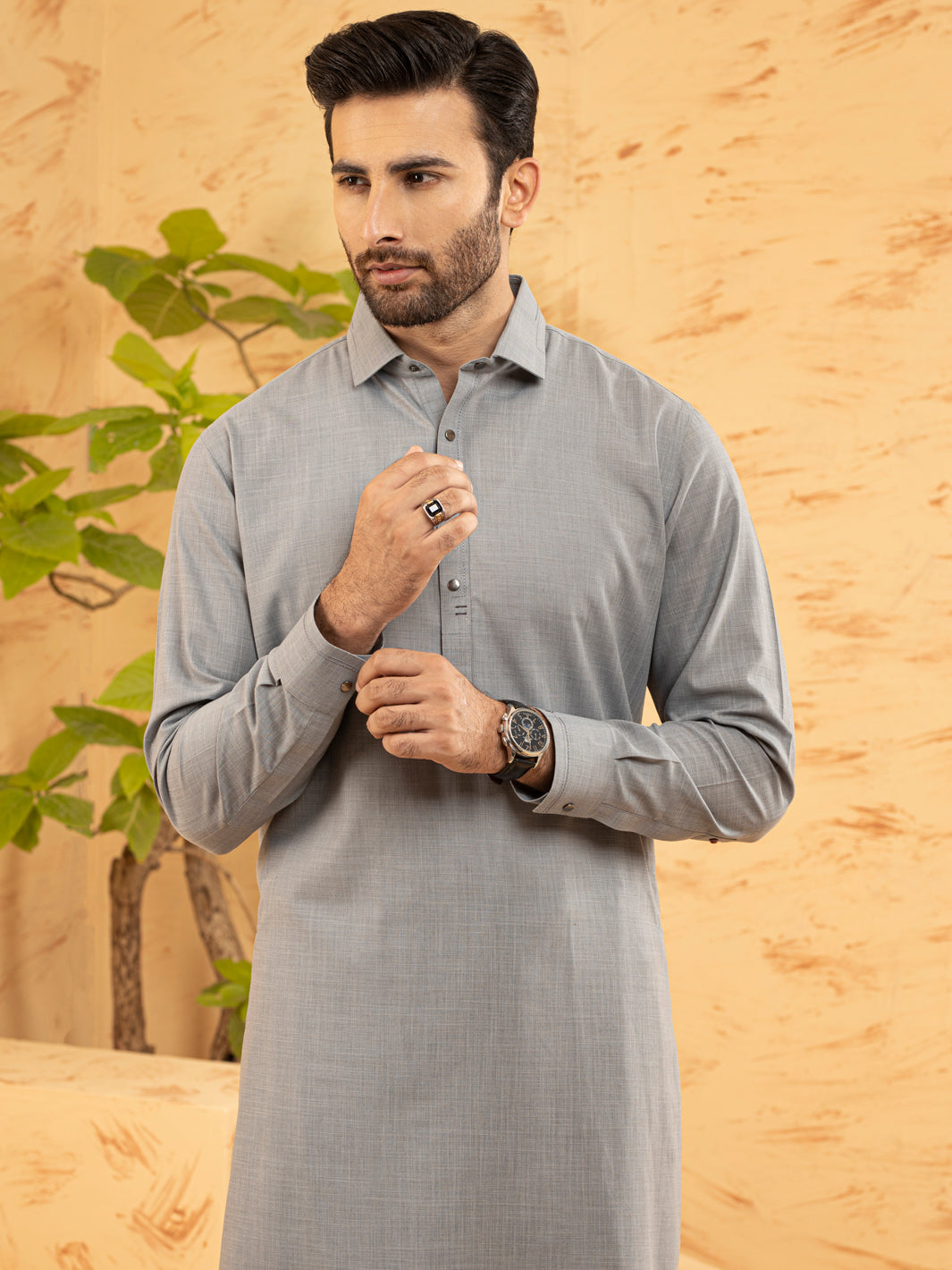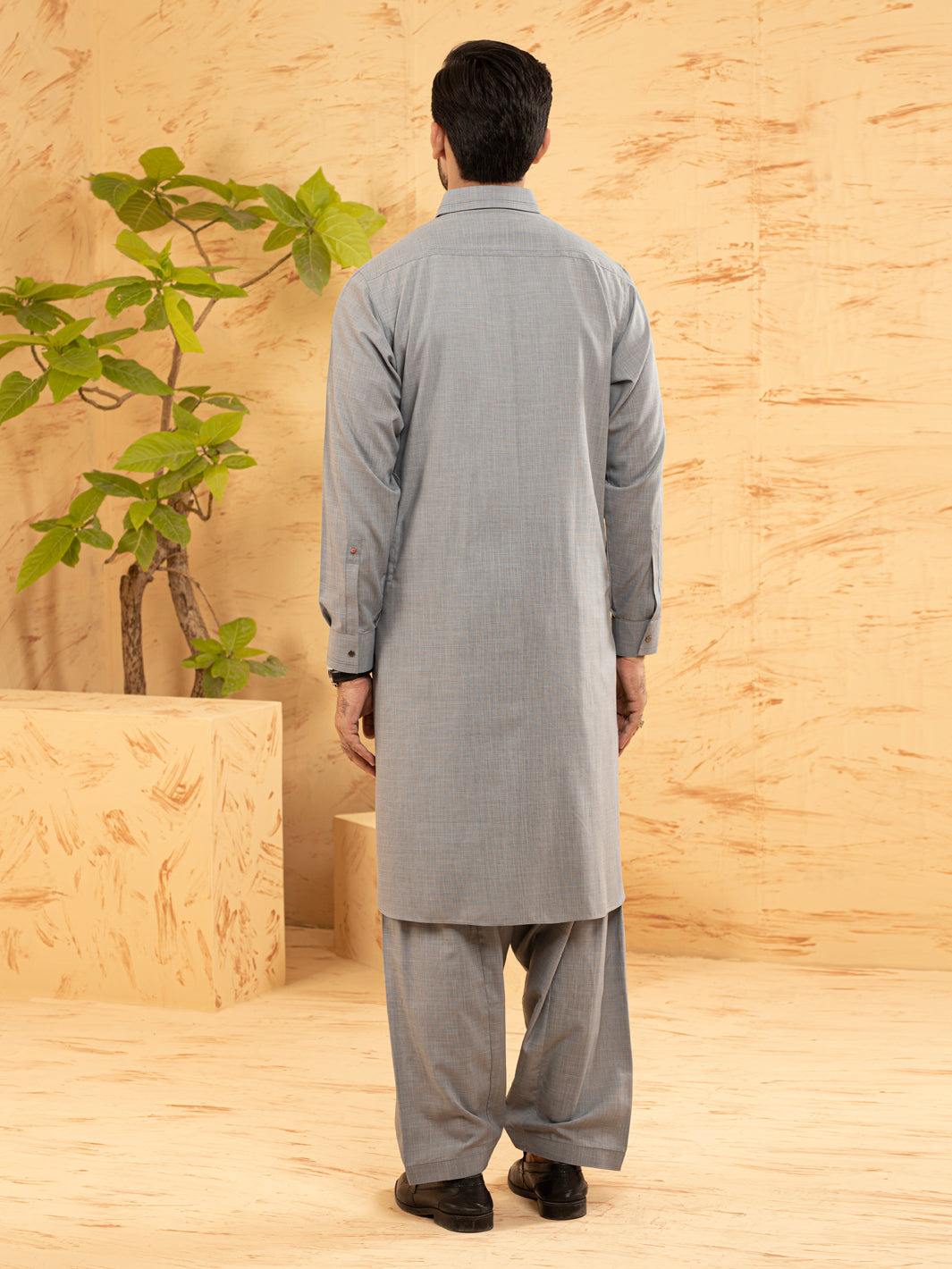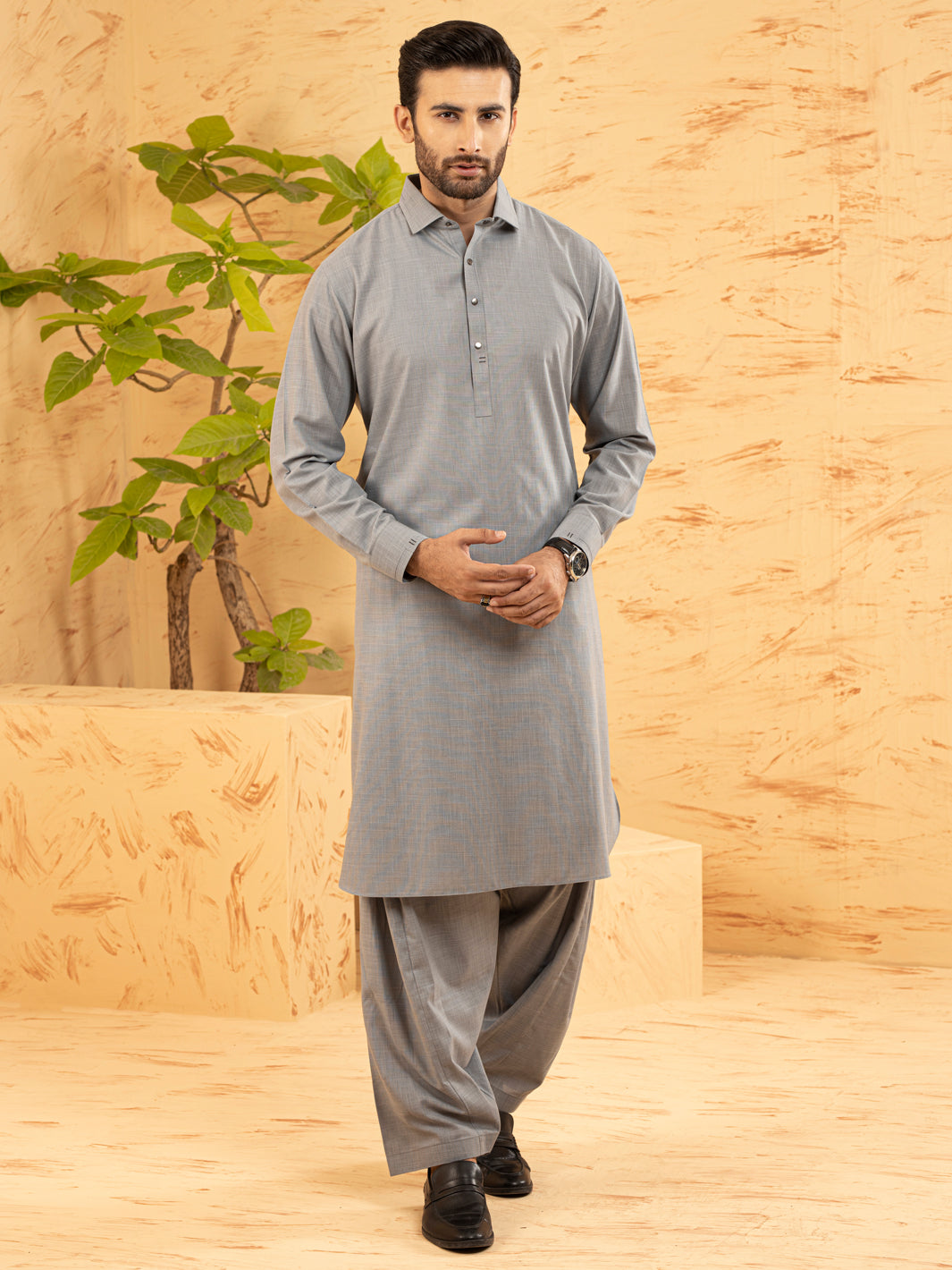 Grey Kameez Shalwar With Metallic Snap Buttons and Basic Design Details