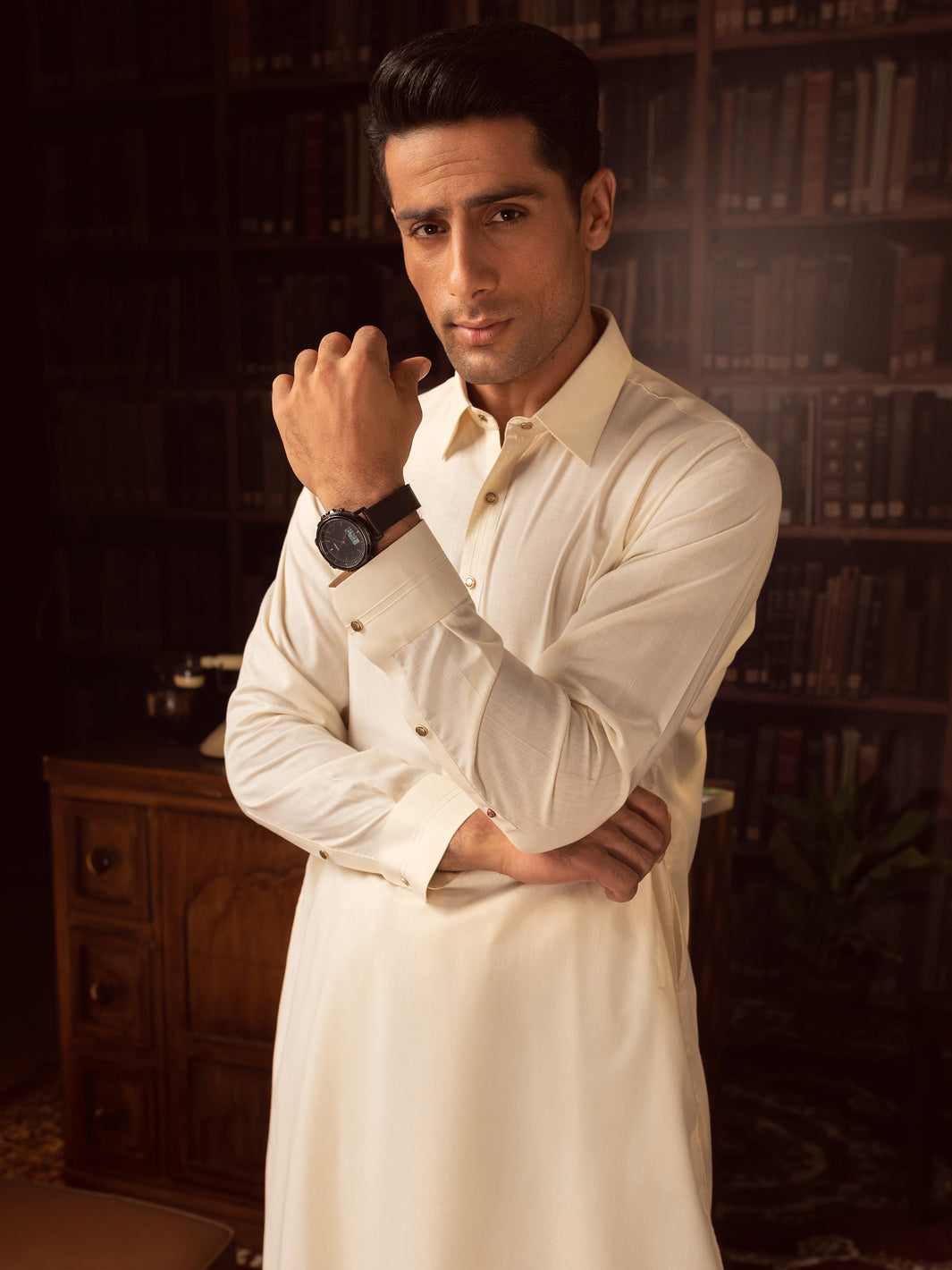 Off White Kameez Shalwar With Stitch Details On Cuffs And Placket
