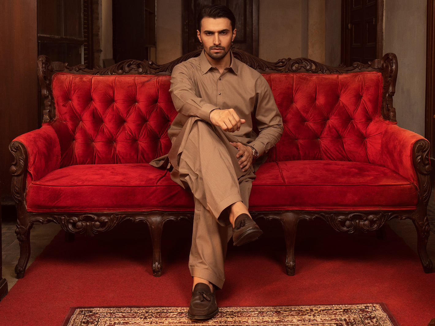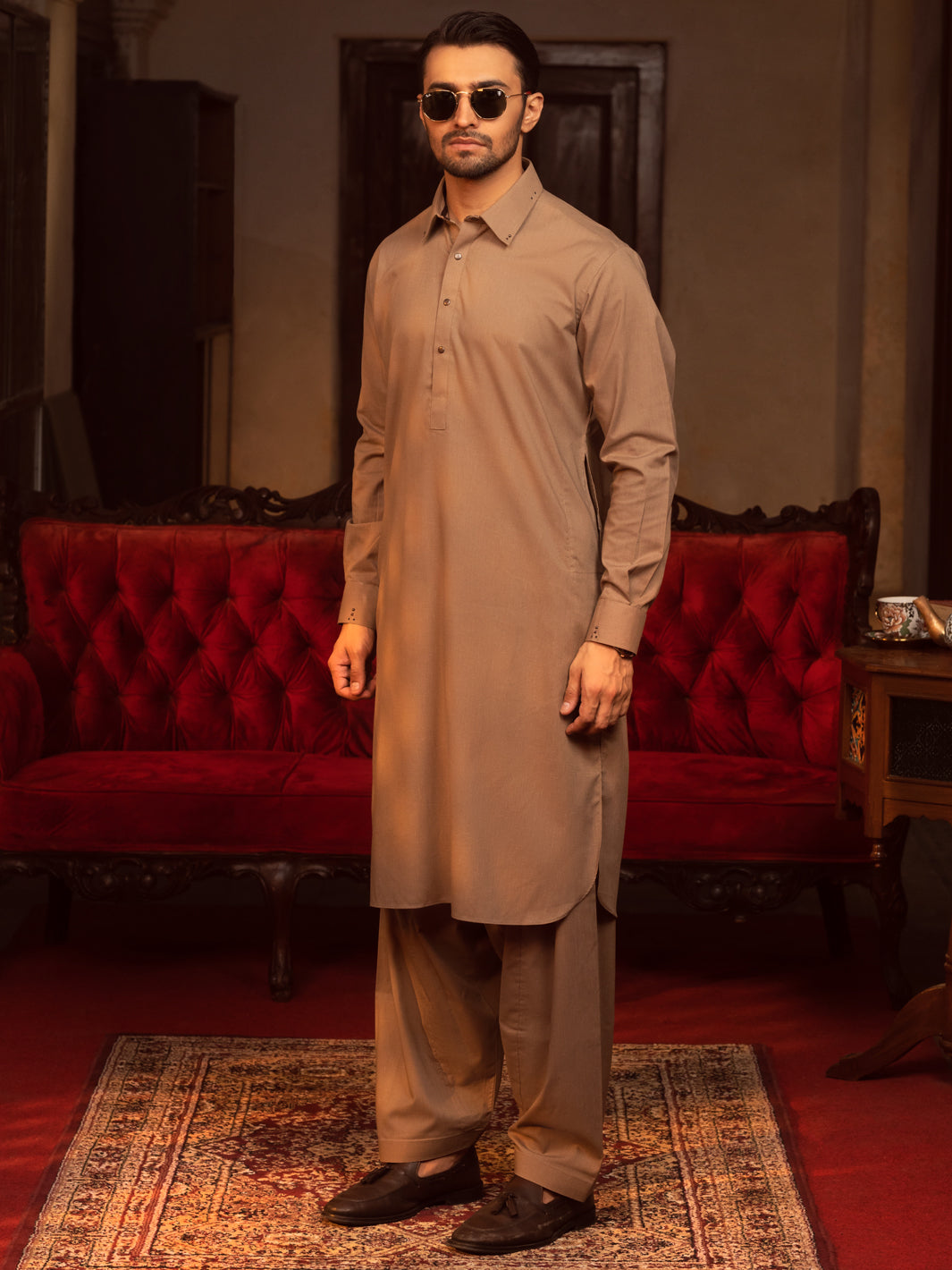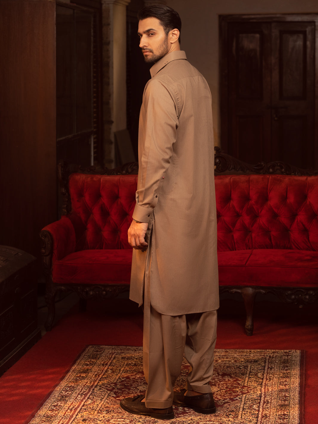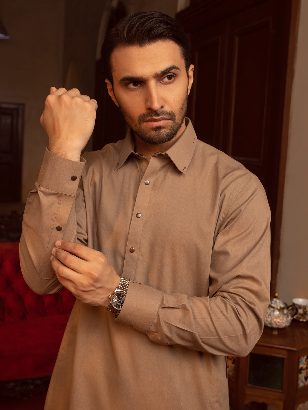 Brown Kameez Shalwar With Rivet Details On Cuffs And Collars