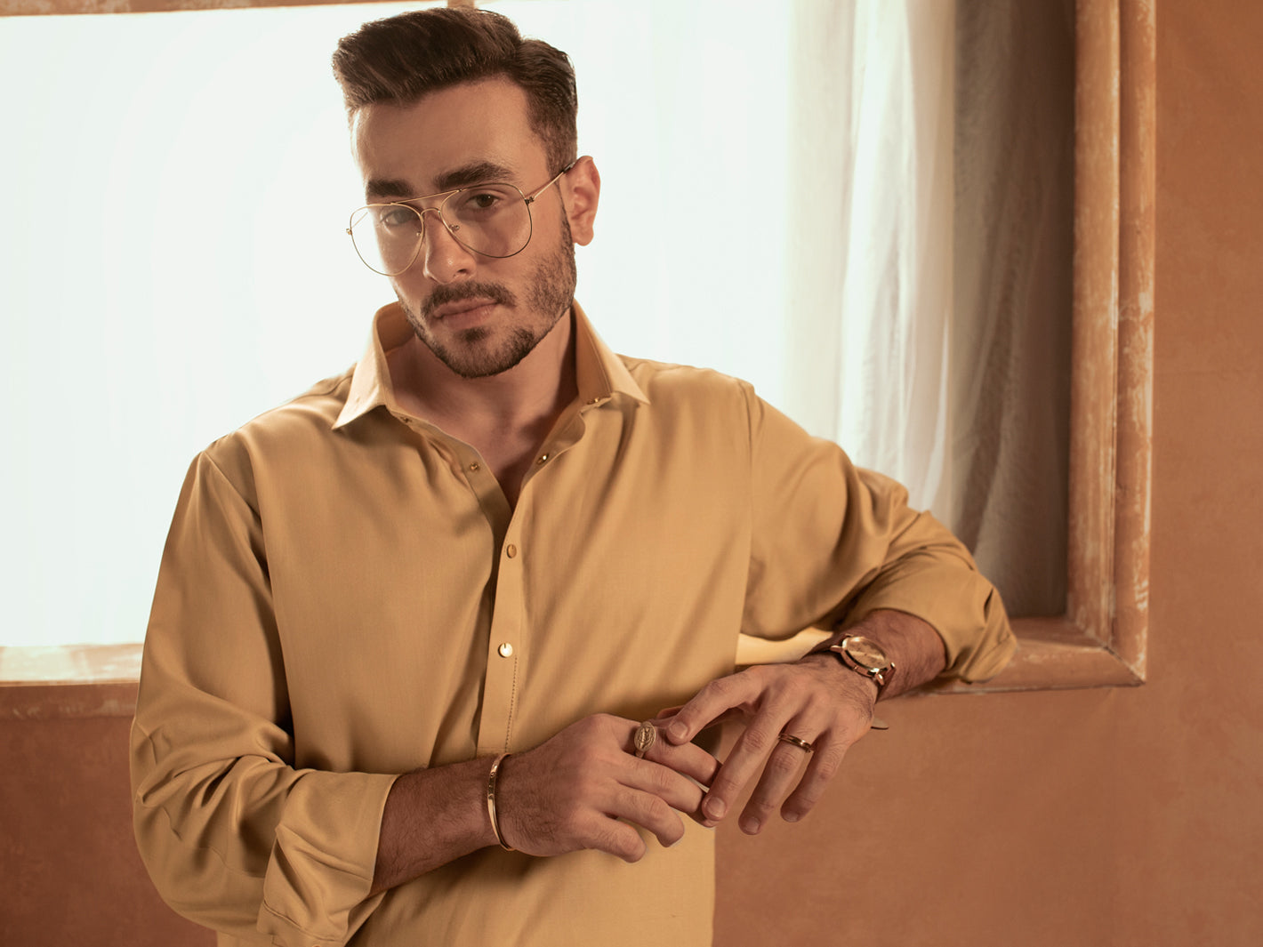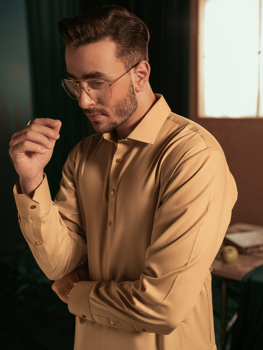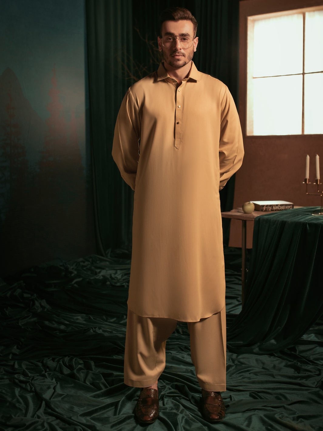 Brown-Beige Kameez Shalwar With Cut and Sew Detail on Collar, Placket and Cuffs
