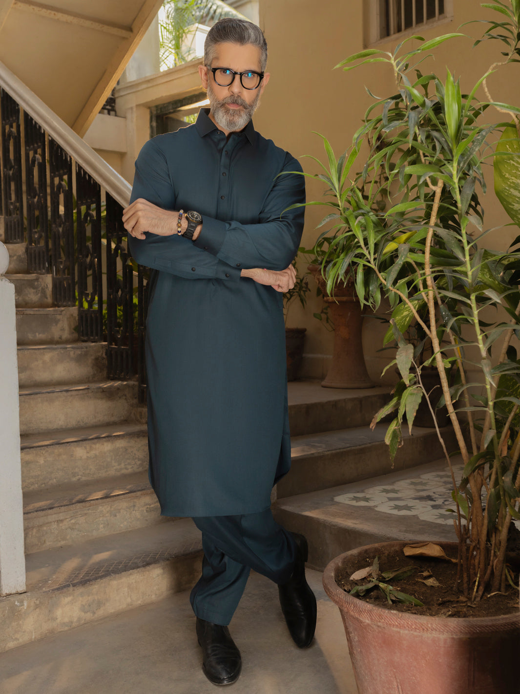 Classic Fit Kameez Shalwar Featuring Minimal Cut and Sew Details With Hints of Contrast on the Placket