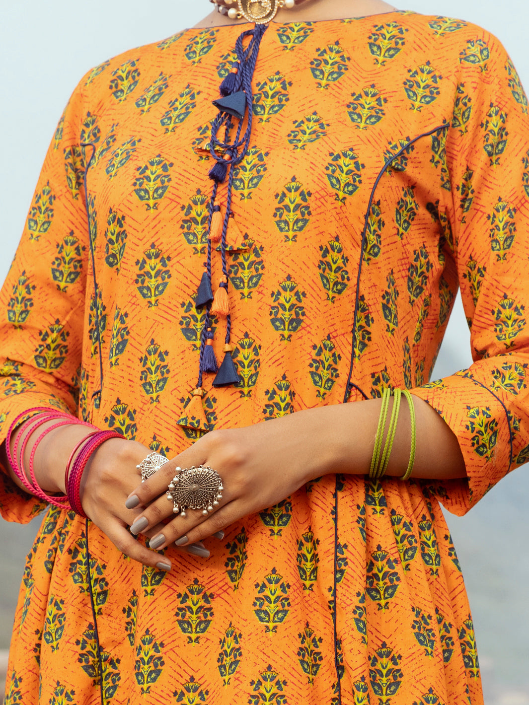 Two Piece Digital Printed, Cambric Knee-Length, A-Line Shirt. Styled With A Panel Cut and Maxi Neckline Detailed With Dori and Tassels and Piping Details on the Sleeves. It is Paired With A Similar Digitally Printed Cambric Shalwar.