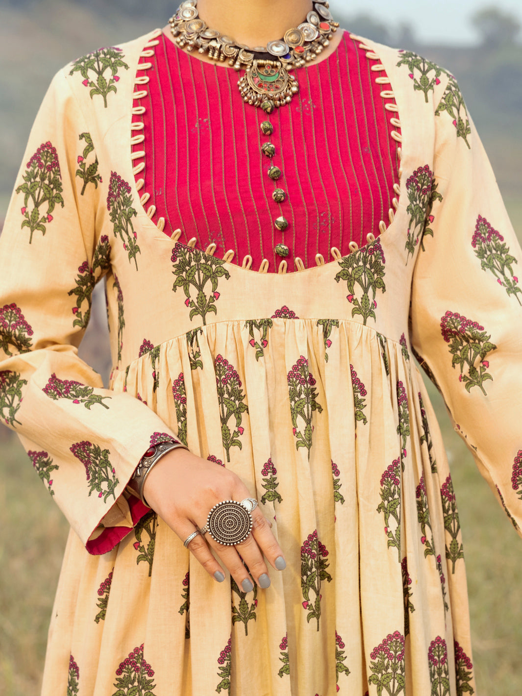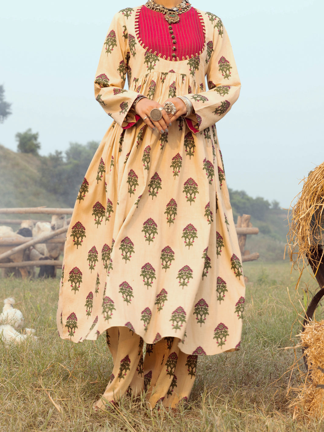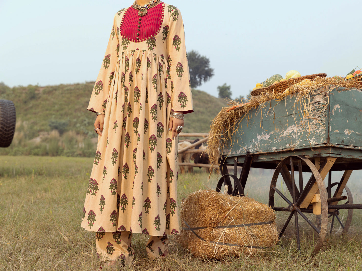 Two Piece Digitally Printed, Cambric Long, Frock Style Shirt. It Has A Maxi - Anarkali Styled Neckline Detailed With Running Stich, Loops and Buttons. It is Paired With A Similar Digitally Printed Cambric Ijaar.