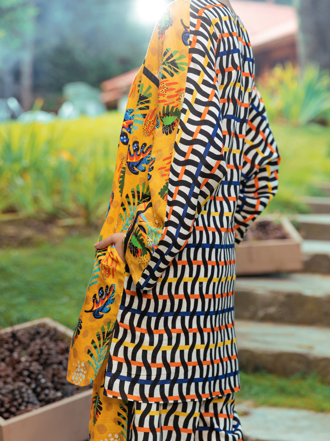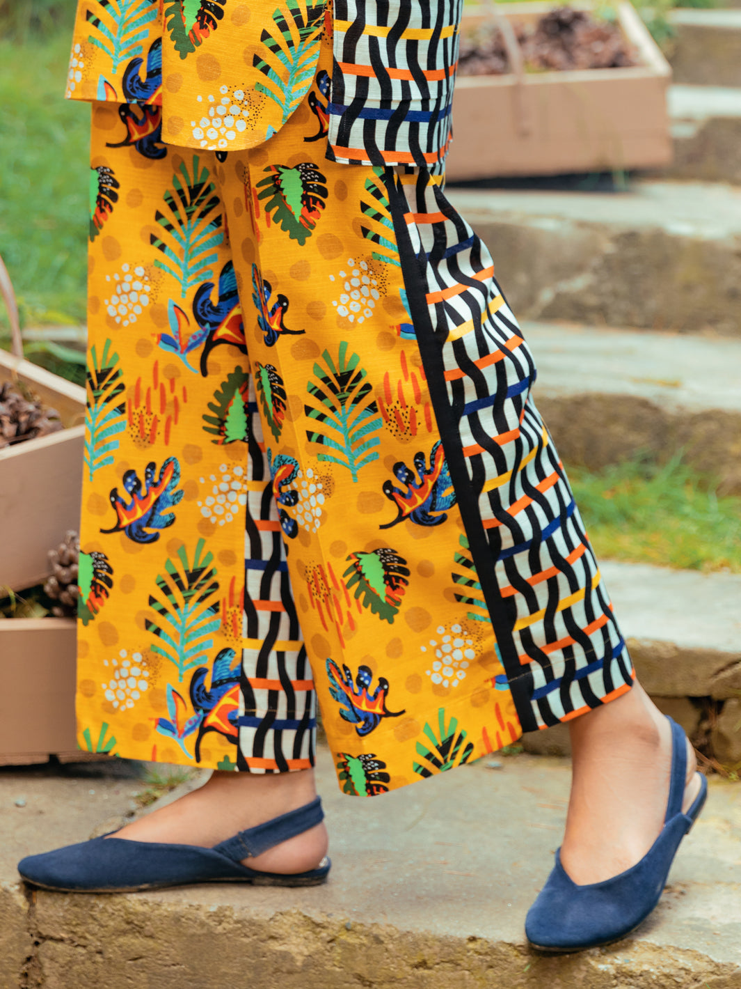 Digital Printed Round Neck Shirt With Different Prints On Front And Back And Trimming Details On Front With Digital Printed Culottes Pants With Different Prints On Front And Back.