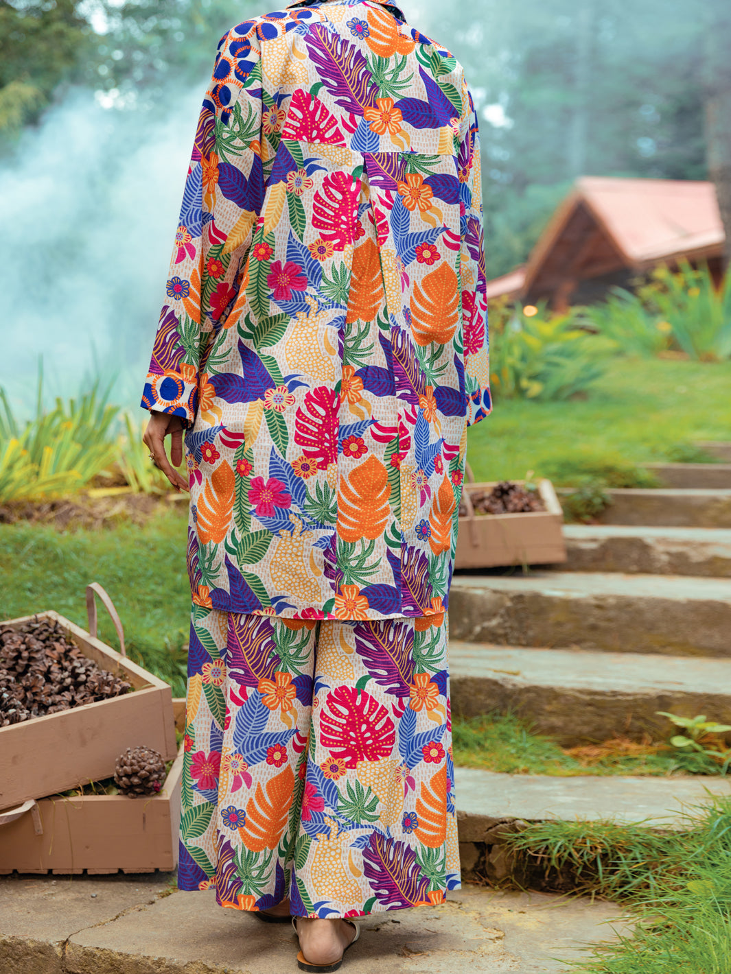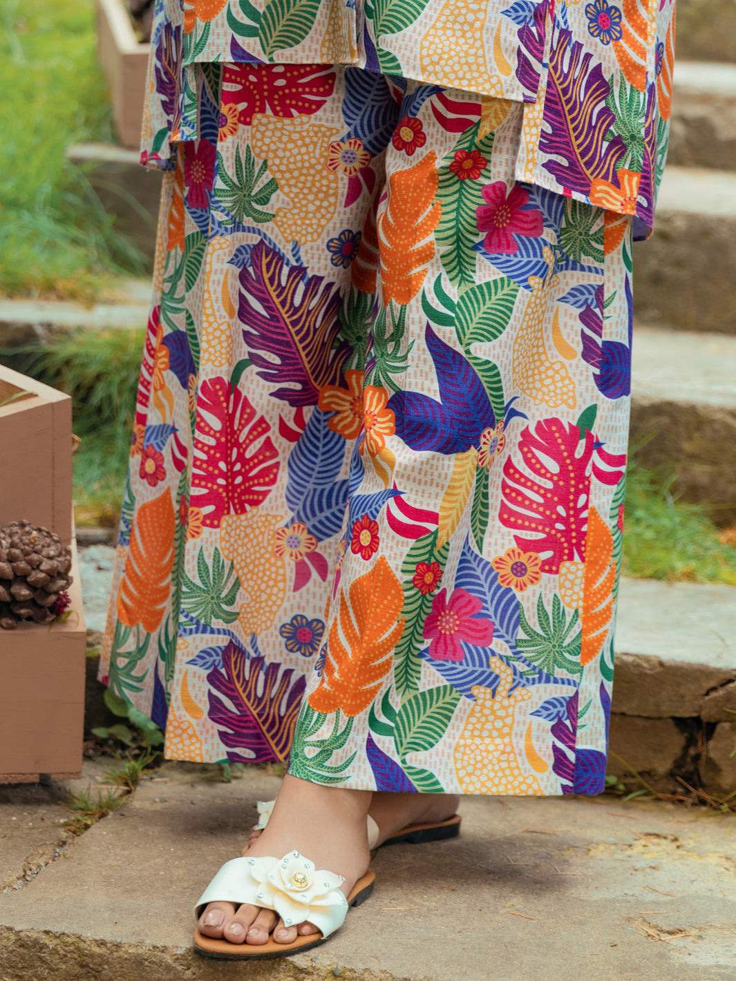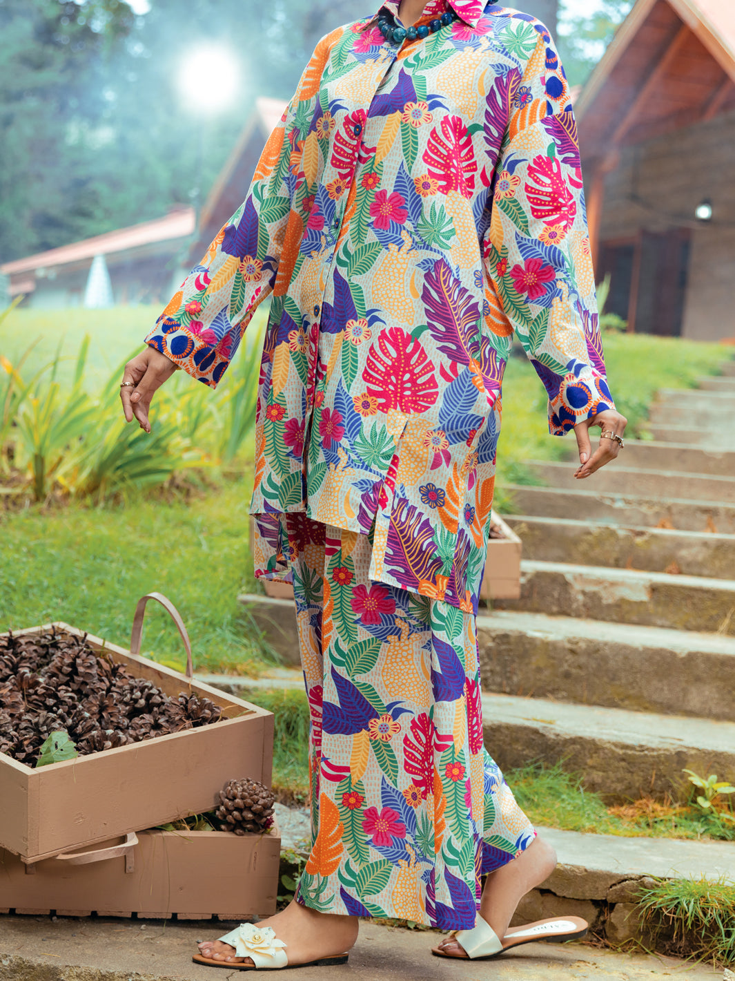 Digital Printed Button Down Shirt, With Drop Shoulders And Detailed With Folded Cuffs Of Contrast Print With Digital Printed Wide Leg Culottes Pants With Side Pockets.