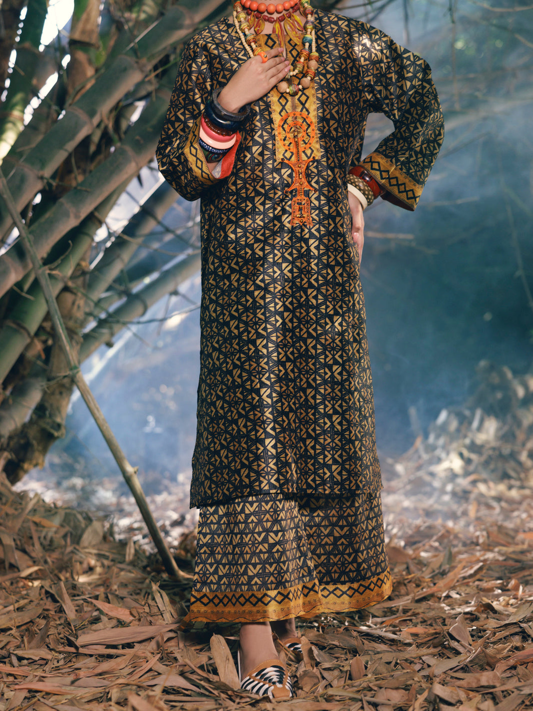 Raw Silk Printed Loose Style Shirt With Embellished Details Of Wood, Beads And Thread On Neckline Paired With Loose Printed Raw Silk Trouser