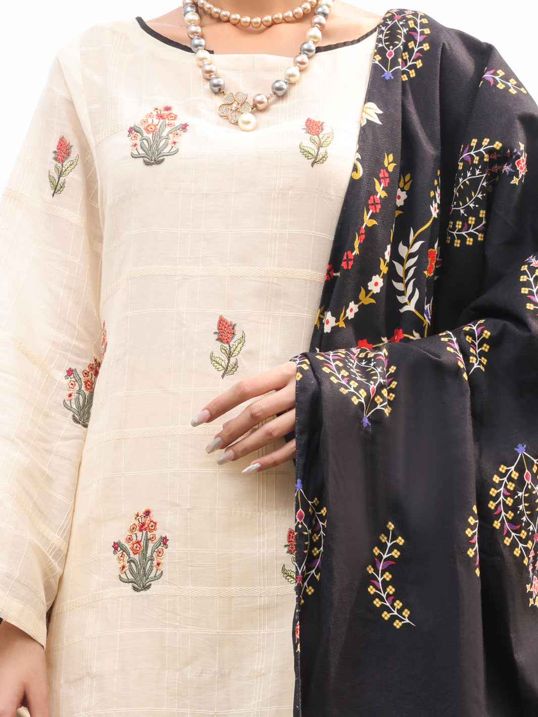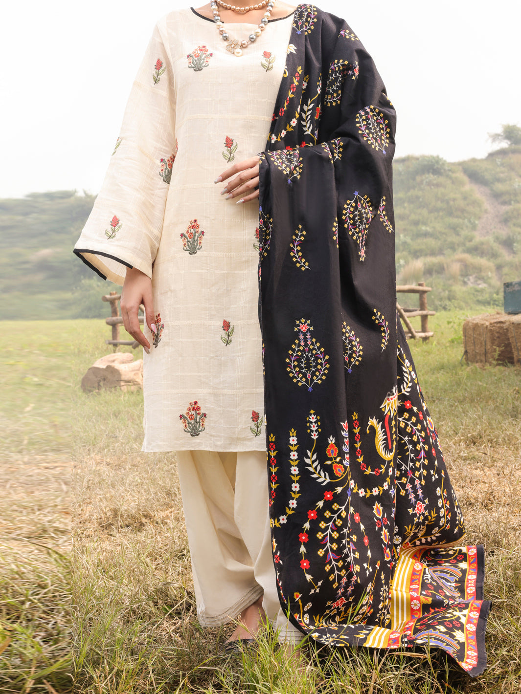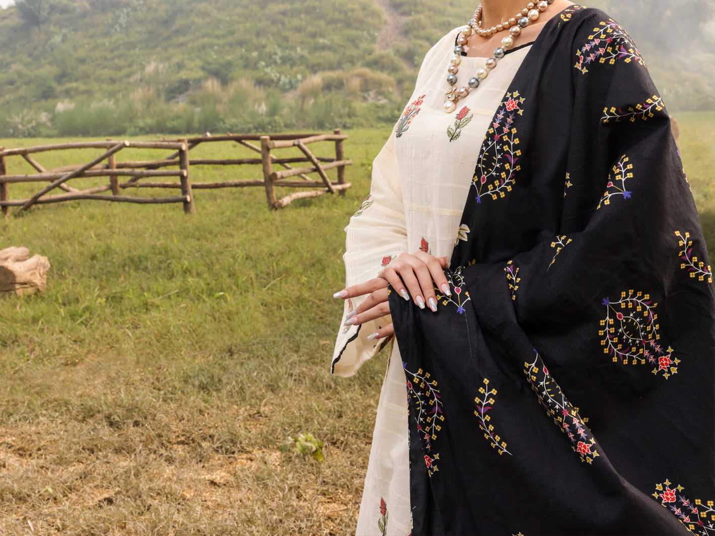 Dobby Shirt With Embroidery Motifs Overall With Black Triming Details Paired With Digital Printed Jacquard Shawl And Shalwar