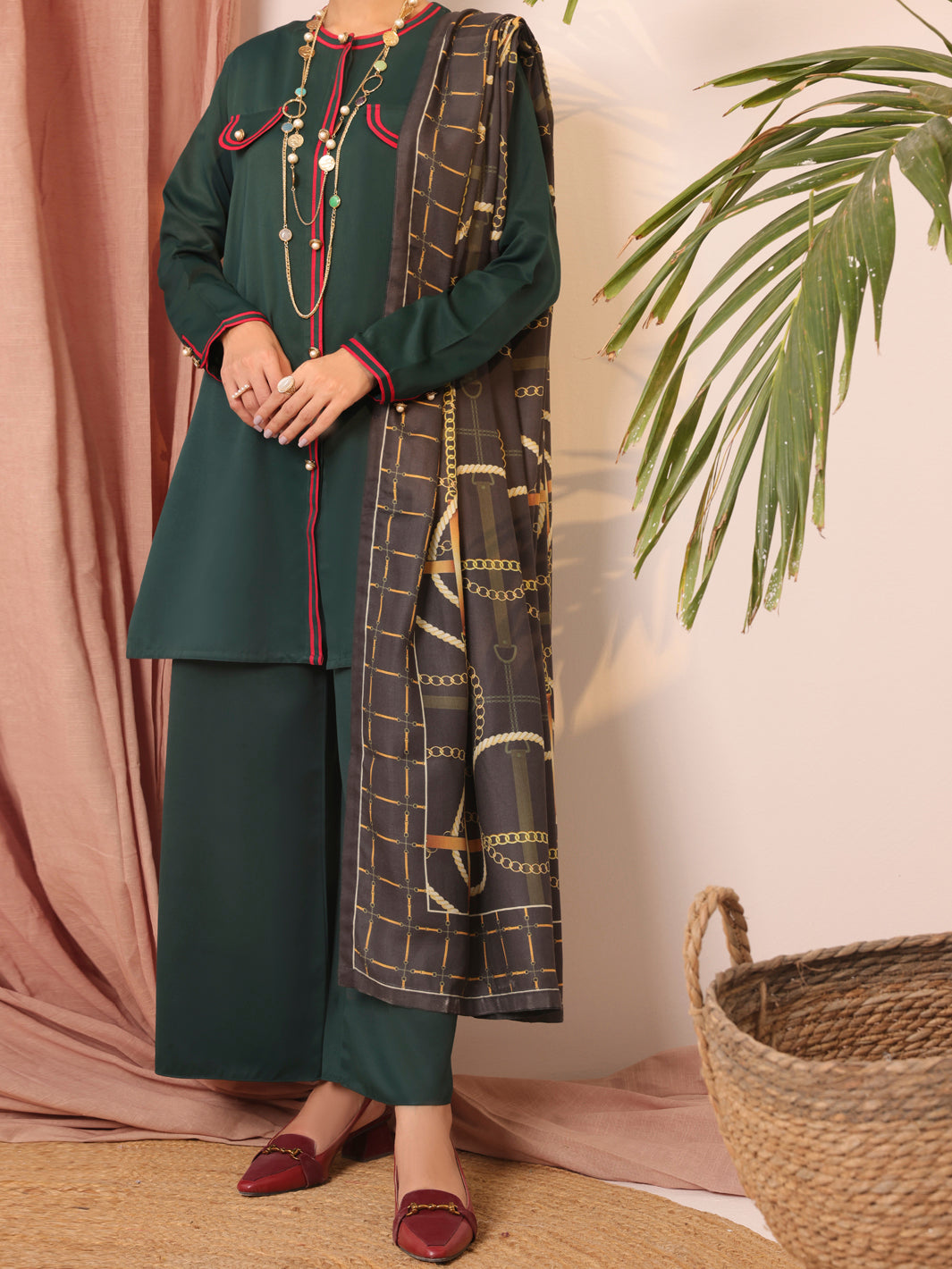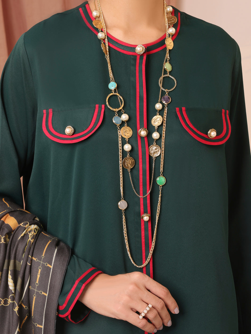 Button Down Emerald Green Shirt With Contrasting Twill Tape Details On It And Adding Charm With Fancy Buttons On Placket And Pocket Paired With Loose Pant And Digital Printed Twill Shawl.
