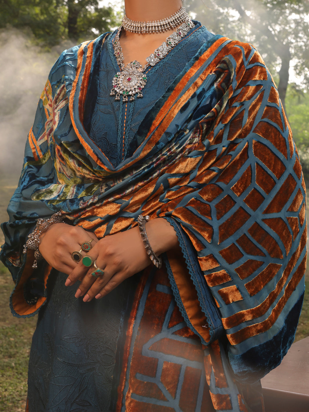 Blue, Viscose Fully Embroidered A-Line Shirt With Contrasting Appliqued Border on the Base. It Has A V-Neckline Which is Beautified With Lace and Trimmings and A-Line Embroidered Sleeves With Embroidered Border, Detailed With Lace and Trimmings. the Back of the Shirt and Viscose Cigarette Pants Are Screen Printed In Self Color. the Piece is Paired With A Velvet Shawl, Printed With Palachi Technique.