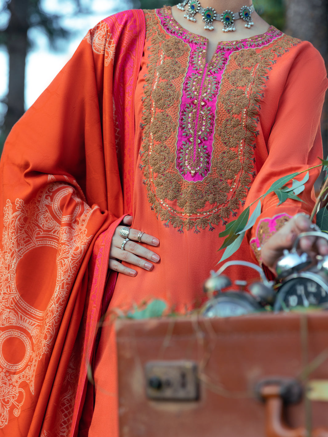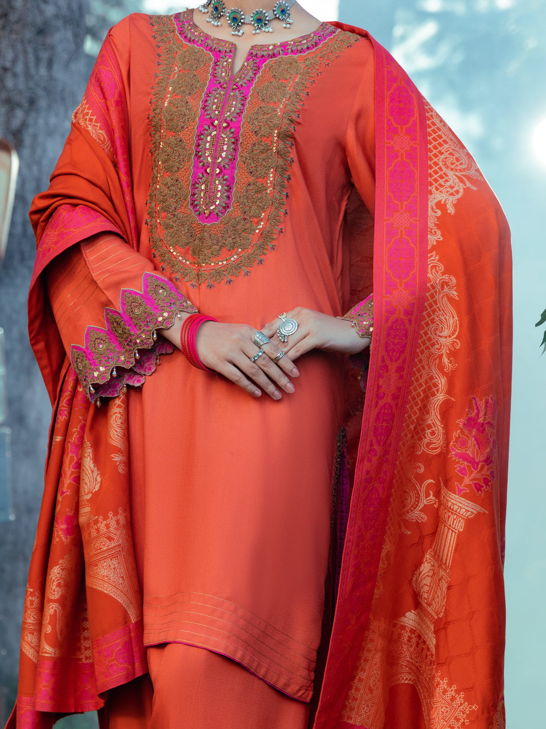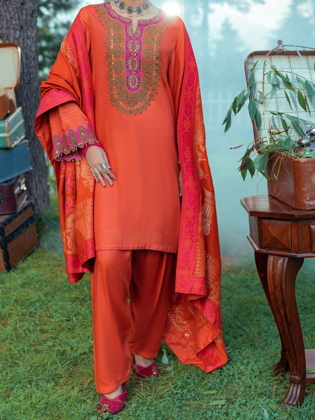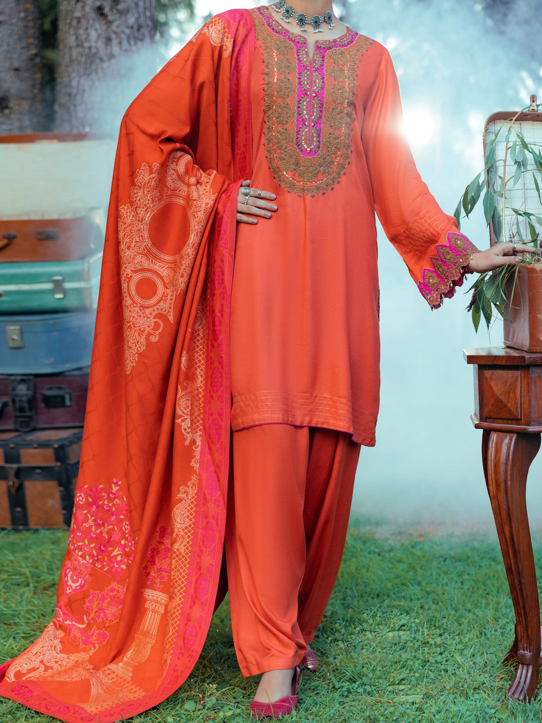 3-Piece Suit With Embroidered Shirt And Shalwar Paired With Vibrant Shawl.