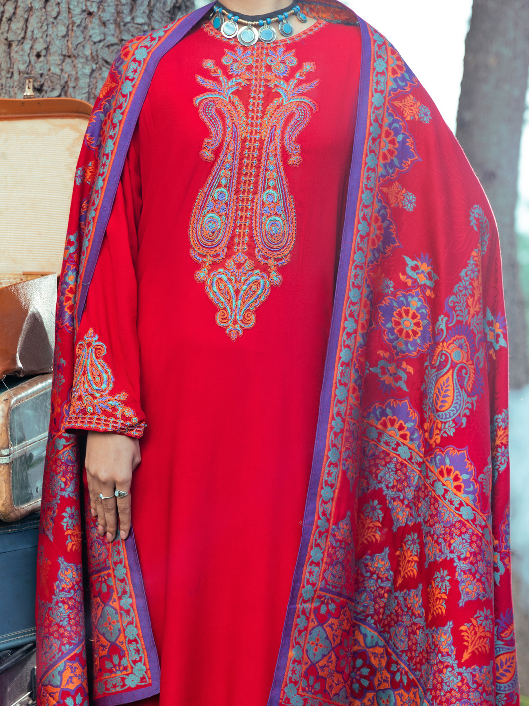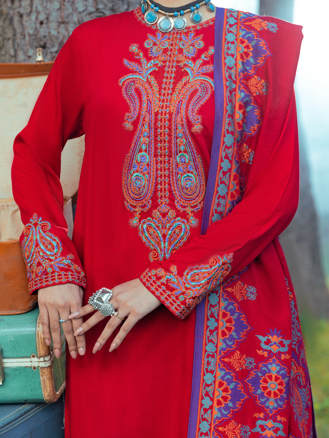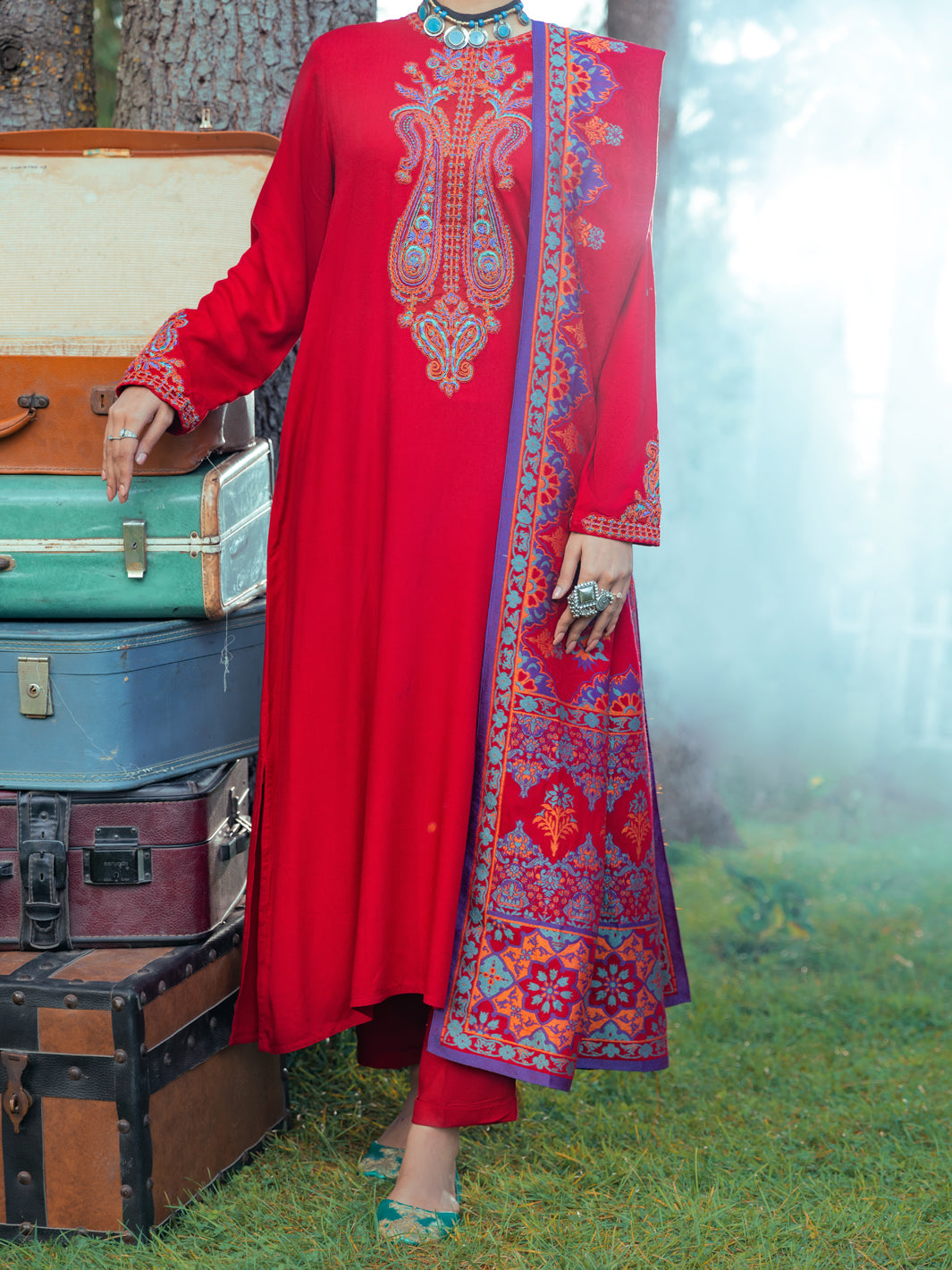 3-Piece Suit, Includes Embroidered Neckline Shirt Paired With Straight Pants And Shawl.
