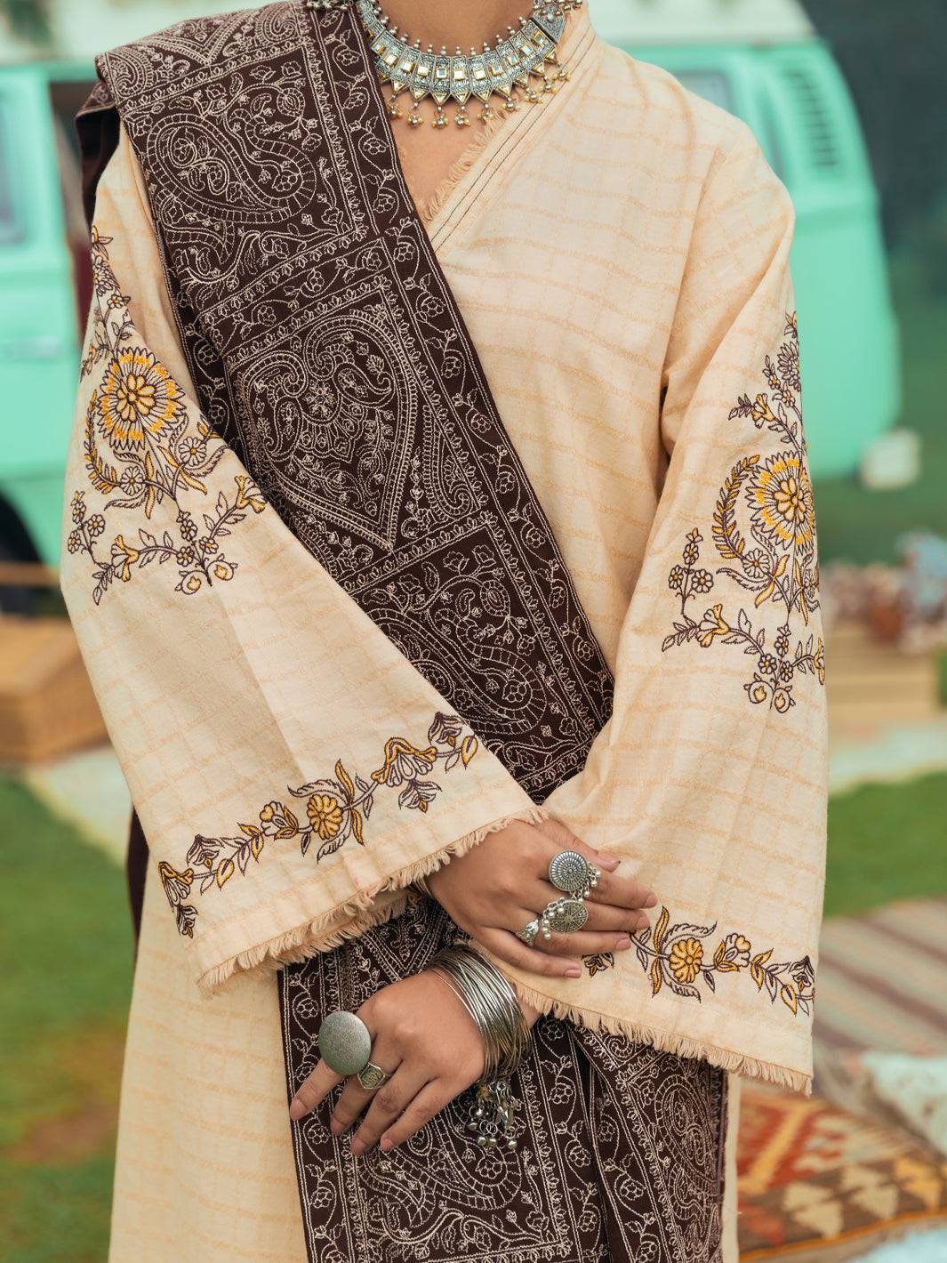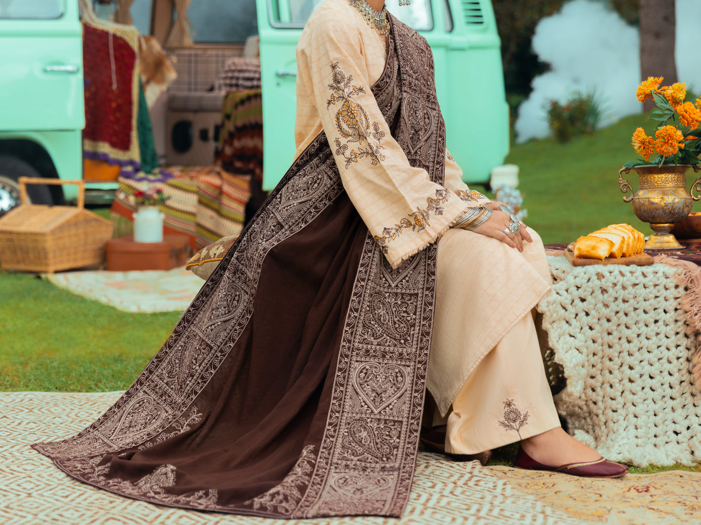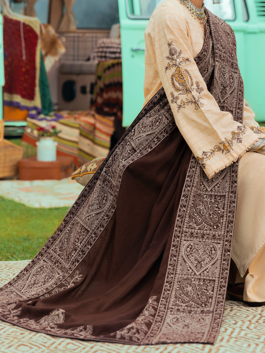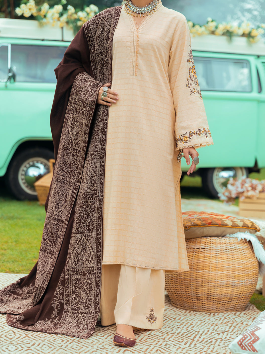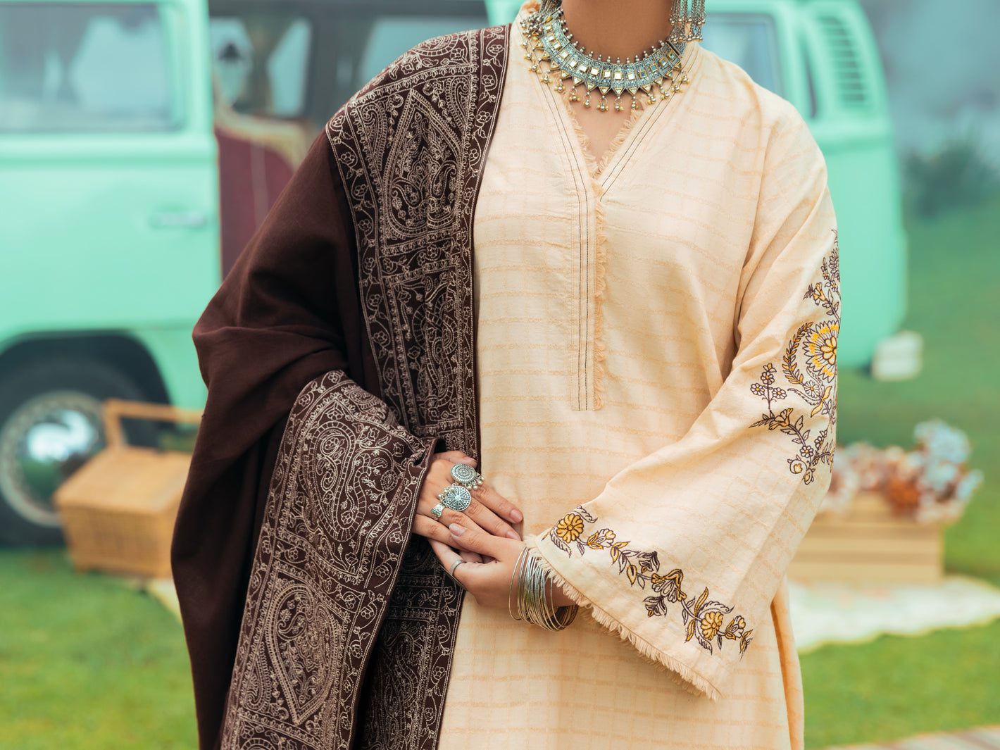 Dobby Fabric Long Shirt, Adorn With Embroidery On Sleeves And Detailed With Laces On Placket And Sleeves Paired With Cambric Trousers & Shawl