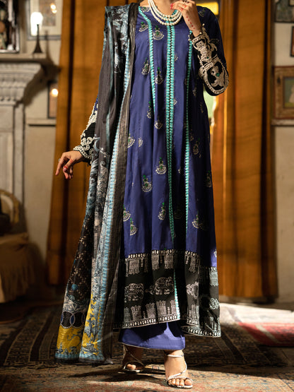 Paneled Digital Printed Silk Front Slit Shirt Detailed With Cord And Stone Embroidery On Sleeves And Block Printed Border On Hemline, Paired With Loose Pants And Digital Printed Viscose Dupatta.
