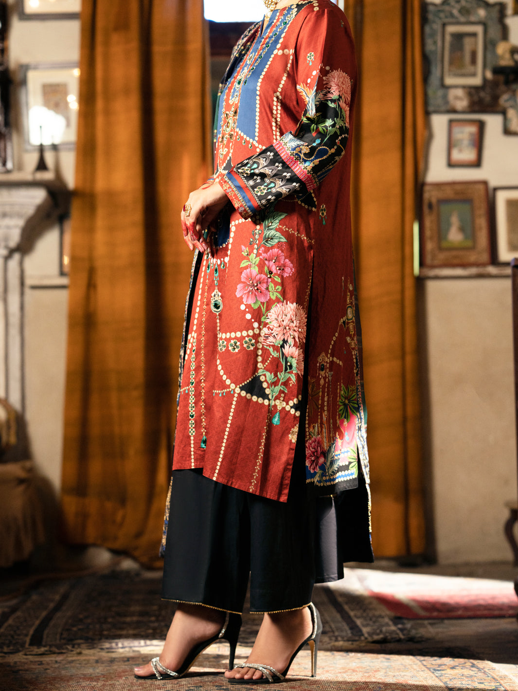 Digital Printed Silk Shirt With Embellished Details On Sleeves And Front Paired With Zari Net Strip Dupatta And Embroidery Details On Pallu And Fitted Pants.