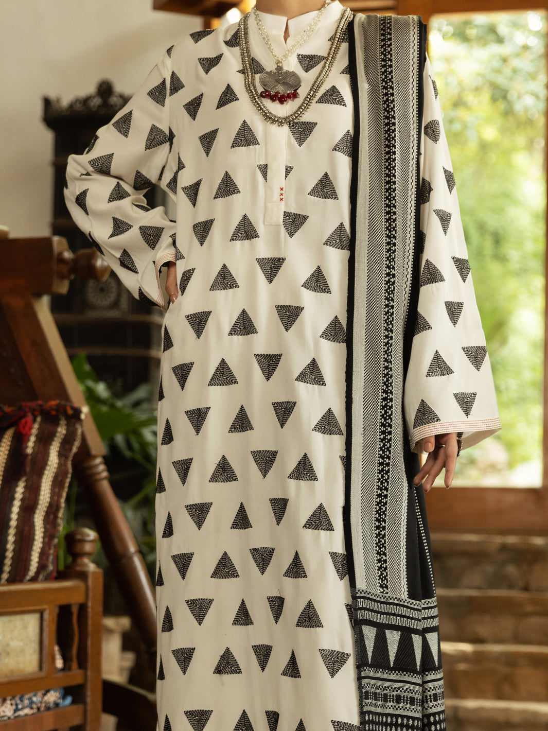 Long Length Jacquard Embroidered Shirt Detailed With Band Collar And Contrasting Red Hand Stitches, Paired With Fitted Pants And Yarn-Dyed Black And White Jacquard Dupatta.