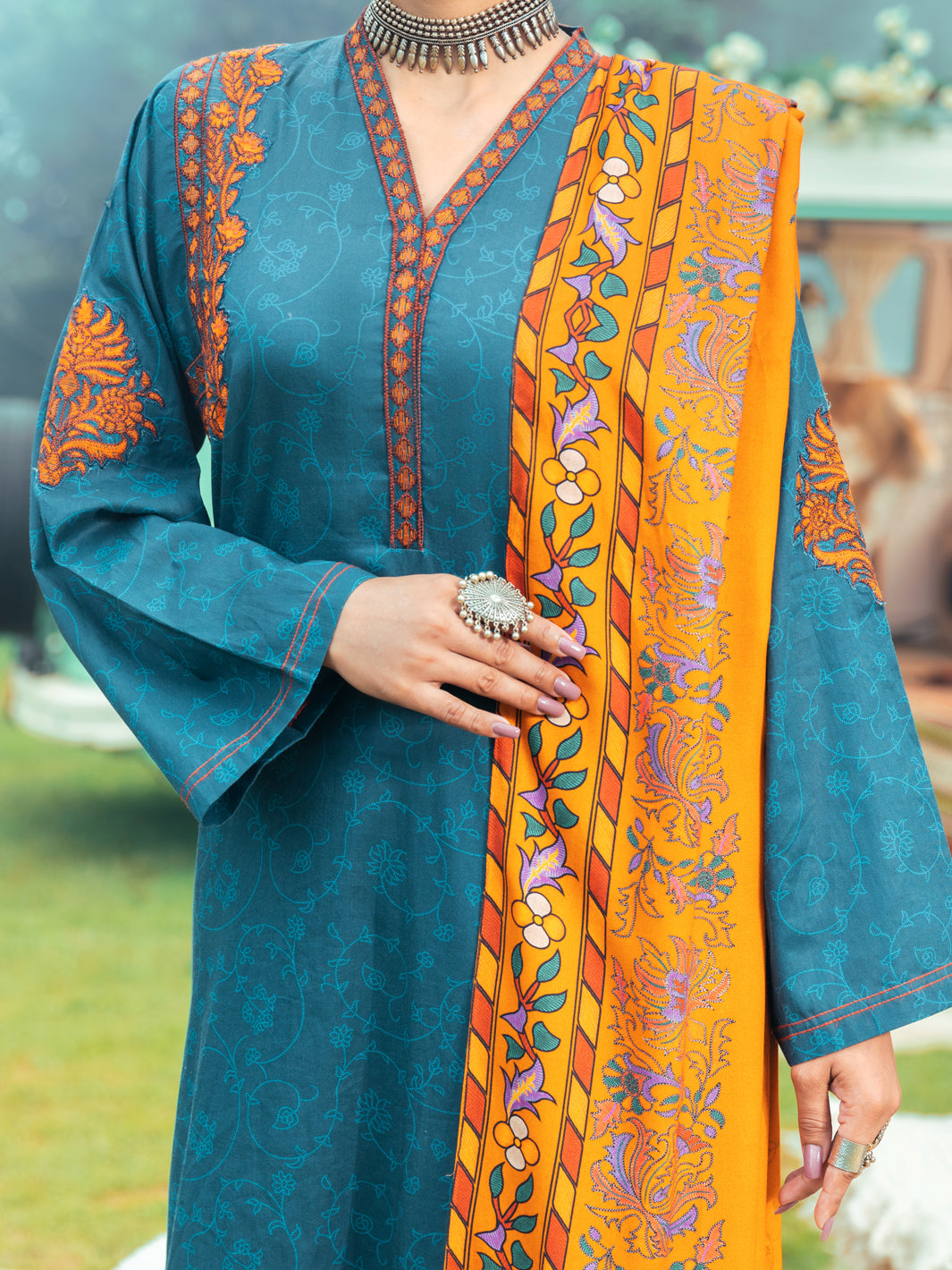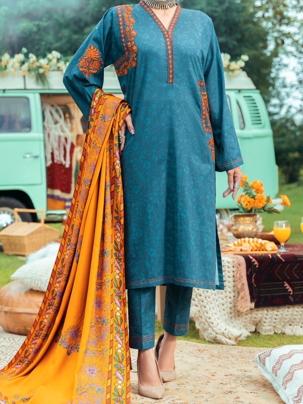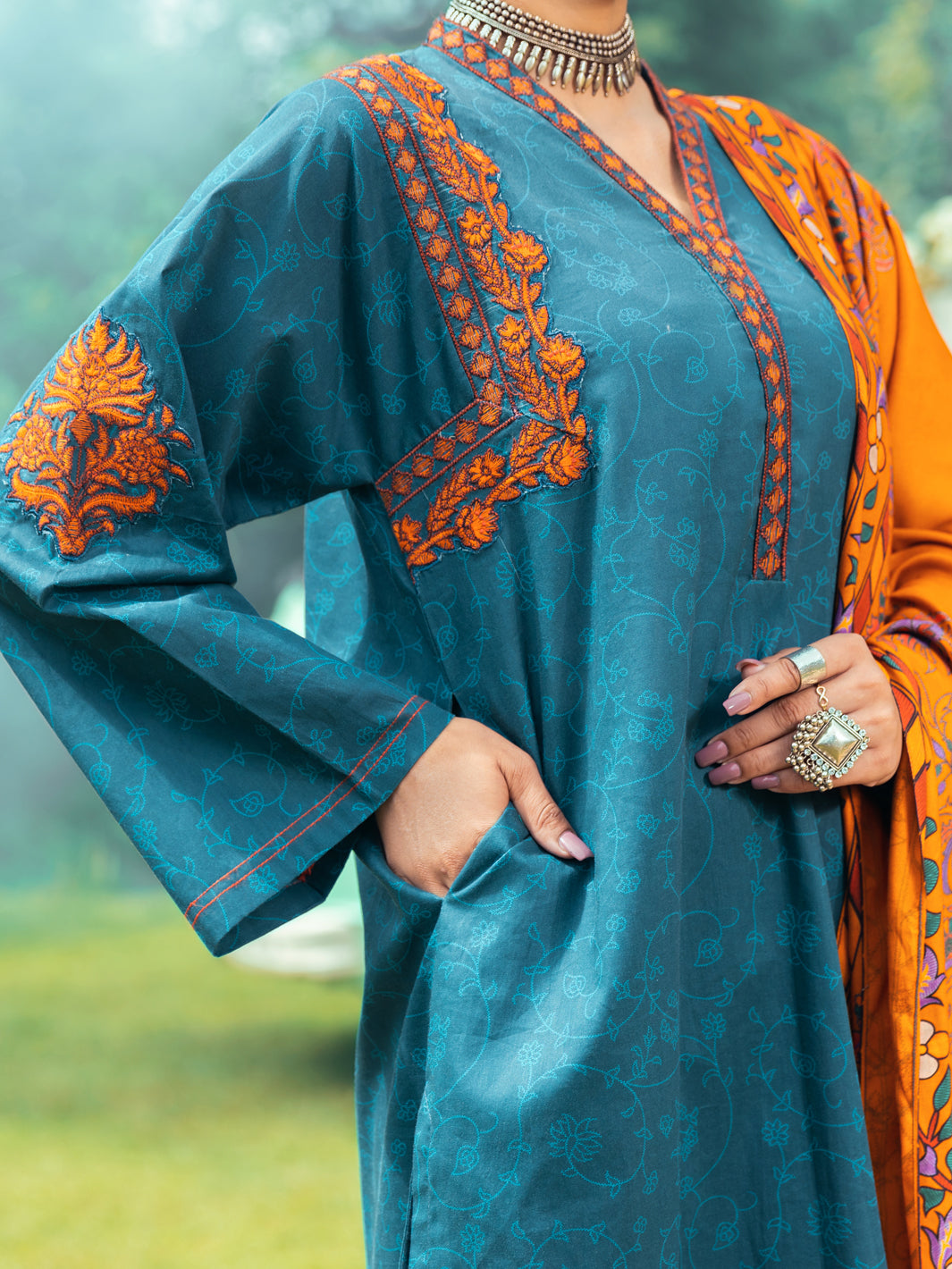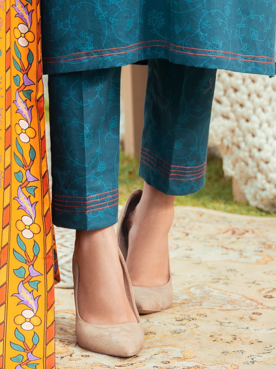 Digital Printed Cambric Shirt With Embroidery On Front And Sleeves With Digital Printed Shawl & Cambric Cigarette Pants With Stitching Details On Bottom.