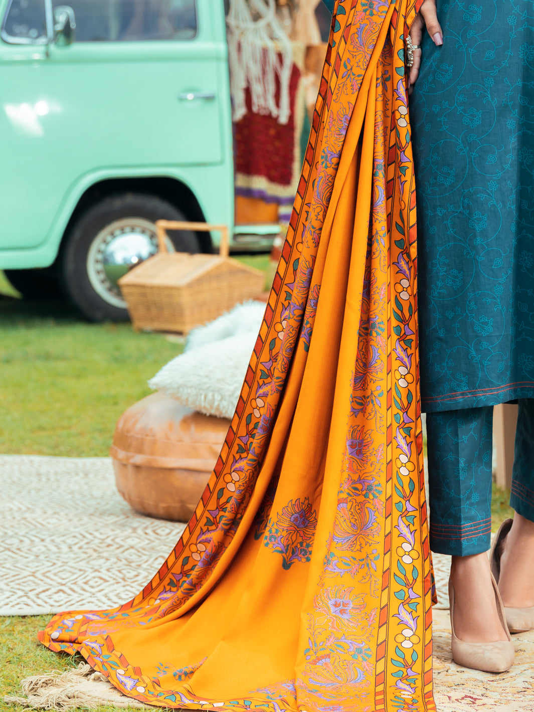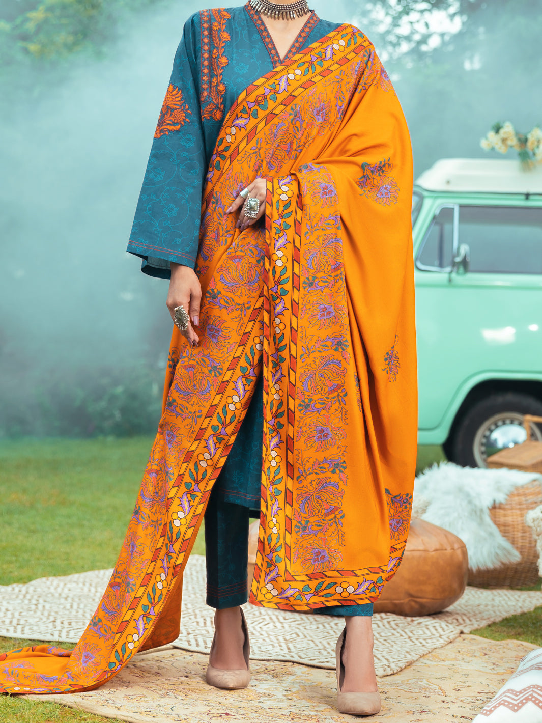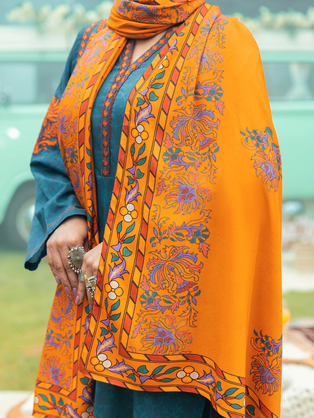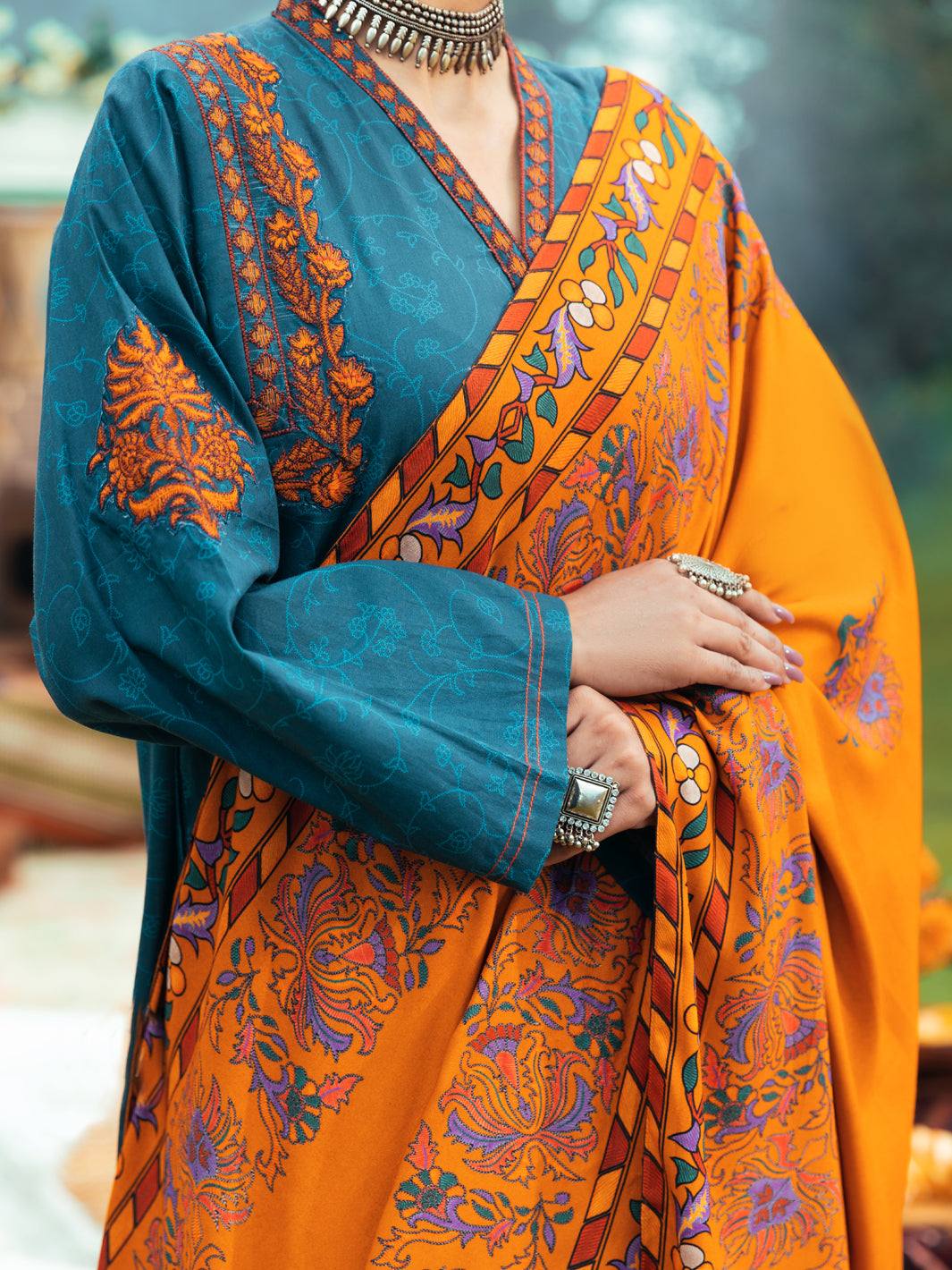 Digital Printed Cambric Shirt With Embroidery On Front And Sleeves With Digital Printed Shawl & Cambric Cigarette Pants With Stitching Details On Bottom.