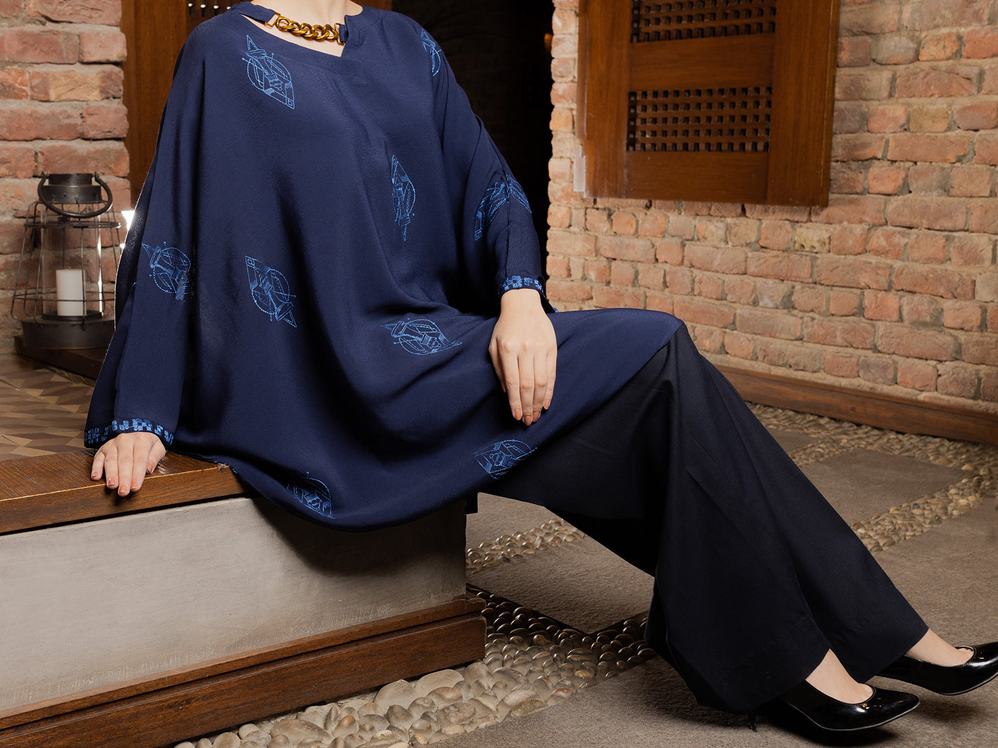 Loose Fitted Georgette Shirt With Batwing Cut Style Having An Asymmetrical Neckline With Bold Chain Detail Along With Chess Inspired Embroidery All Over.