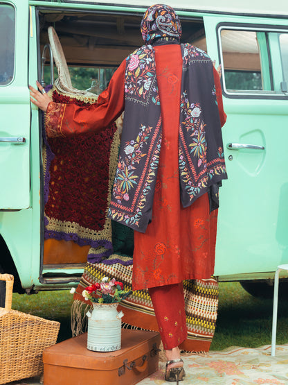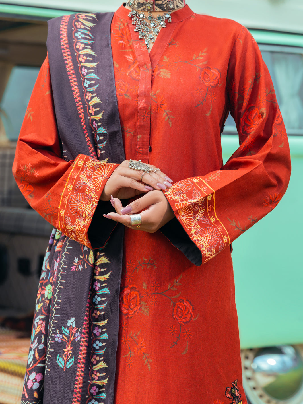 Digital Printed Khaddar Shirt, Detailed With Embroidered Bunches On Bottom Of Shirt And Sleeves.