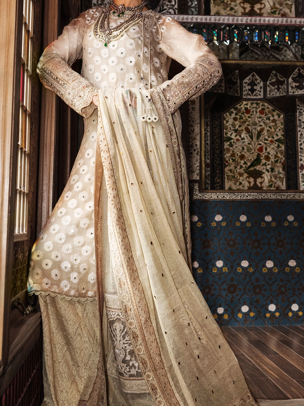 Almirah Combines The Intricate Work Of Marble And Mirror Together For This Outfit. Hand Work Embroidery And Mirror Work Fused In This Long Shirt. Paired With Dhaka Pajama Adorn With Mirror Embroidered Cut Work Khaddi Net Dupatta.