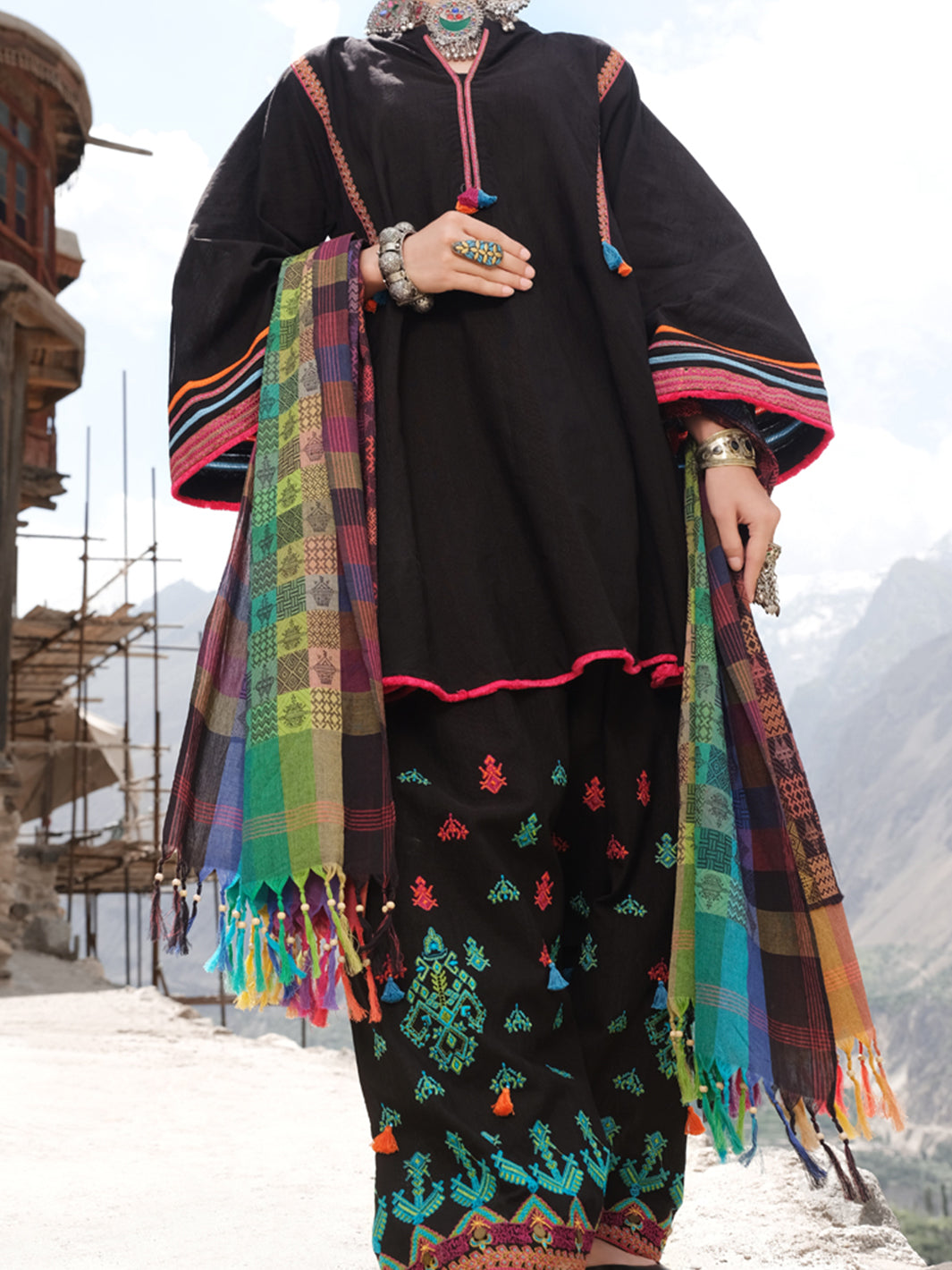 Frock Style Khaddar Shirt With Embroidery And Tassel Details Adorn With Embroidered Bell Sleeves. Paired With Electric Colored Embroidery And Tassel On Shalwar And Multi-Color Jacquard Shawl.
