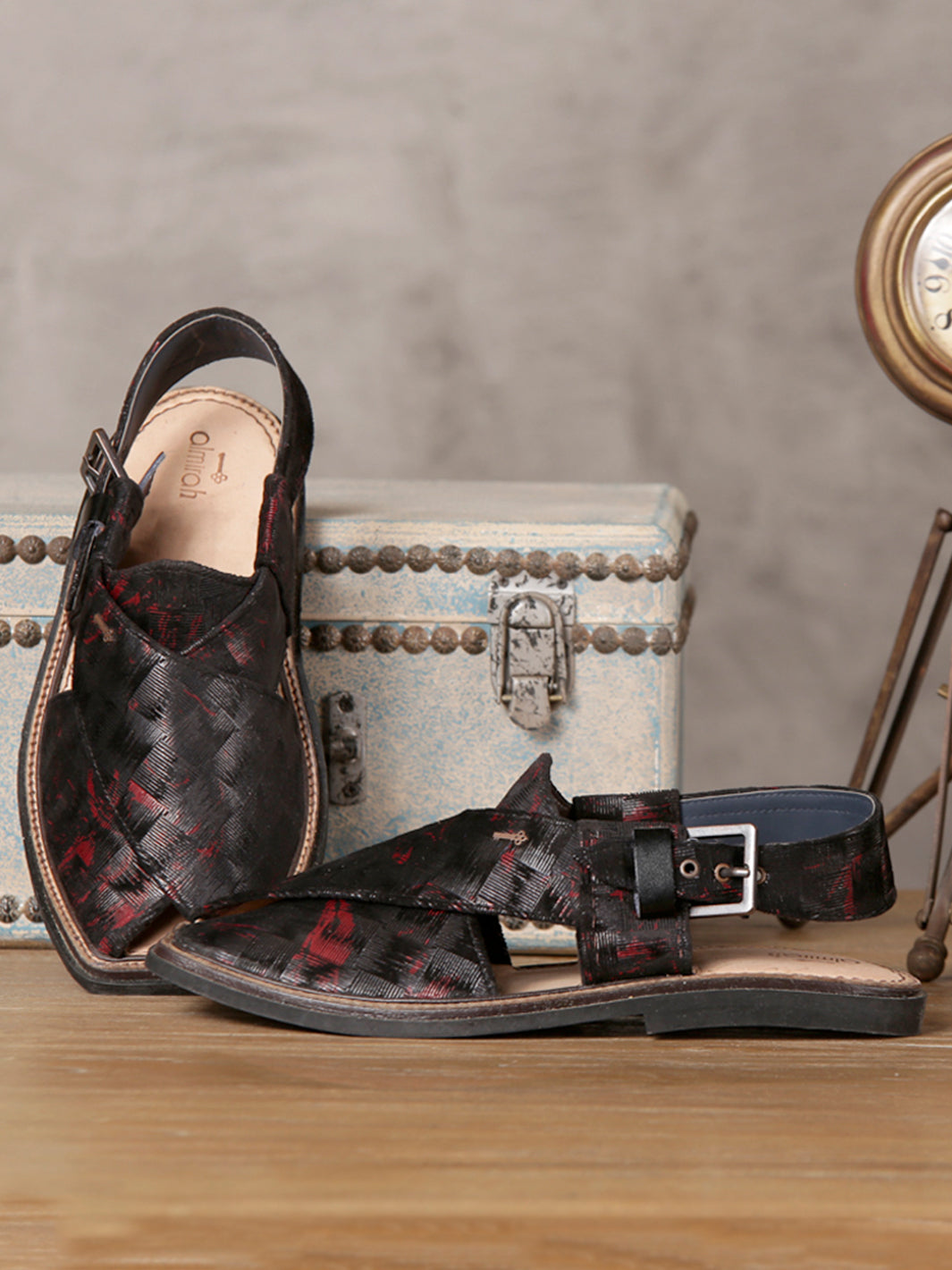 Black & Red Leather Peshawari Chappal - MFW-TFB-011
