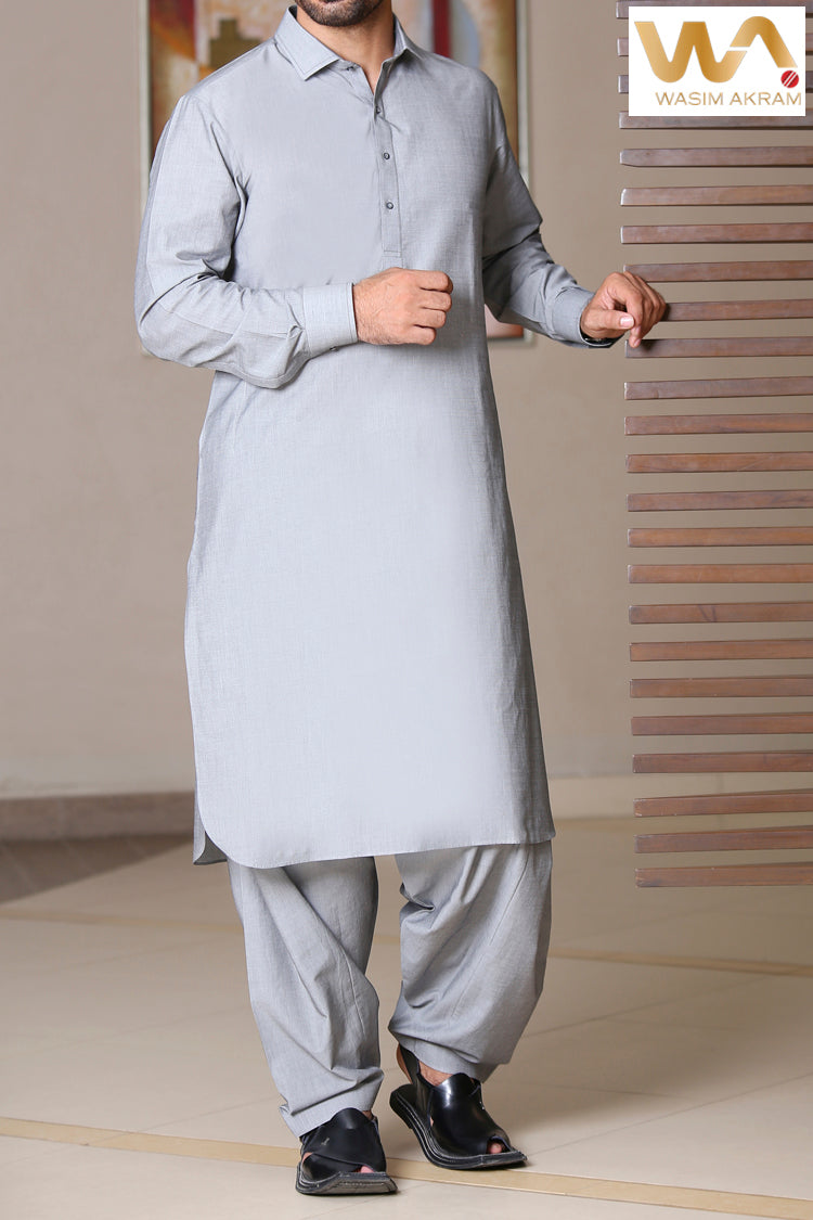 Ash-Grey Kameez Shalwar Stitched In CVC Fabric With Cuts & Sew Detail On Collar And Cuffs.