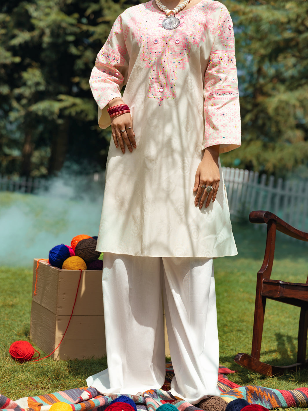 Self-Dobby Kurti Having Composed Screen Printed Design Enhanced With Mirror And Embroidery Touch Up