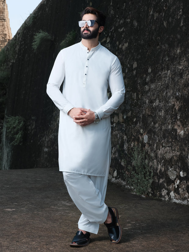 Cut And Sew Kurta Shalwar Stitched In Blended Fabric With Detail On Collar, Placket And Sleeves