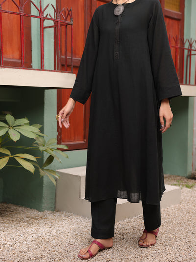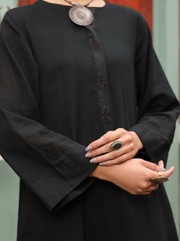 Black Cross Hatch Fabric Cord-Set With Embroidery Details On Placket And Sleeves.