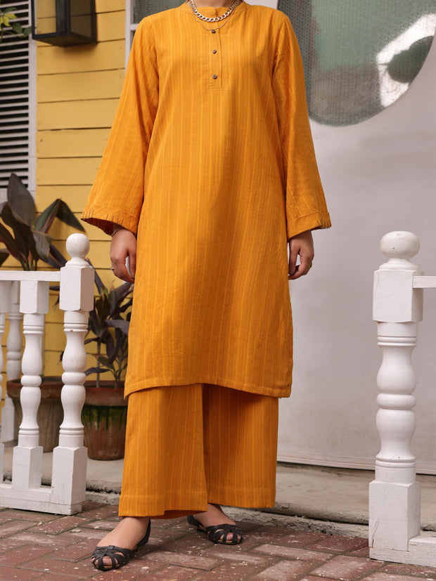 Bright Yellow Dobby Cord-Set With Wooden Button Details On Plackets.
