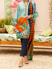 Tropical Digital Printed Cambric Shirt With Band Collar And Tassel Detail On Neckline Paired With Cambric Digital Printed Dupatta And Fitted Pants.