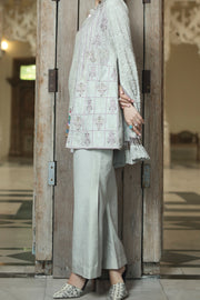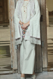 Embroidered Chantilly Lace Coat Paired With Printed Shirt And Boot Cut Pants Along With Net Dupatta.