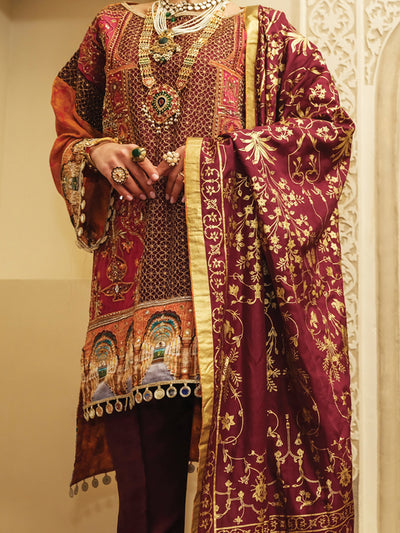 The Vivacious Fuchsia Pink Coat Features Applique And Fine Needlework Embroidery With Accent Of Mirror In The Depiction Of Arches Off The Sheesh Mahal. This Subtle Masterpiece Is Styled With A Pleated Inner Shirt Paired With Culottes Appliqued With Digital Printed Embellished Borders.