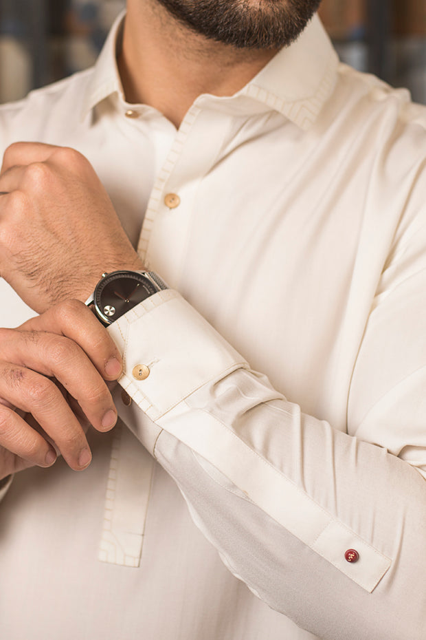 White Kameez Shalwar Stitched In Blended Fabric With Cuts & Sew Details On Collar Placket And Cuffs.